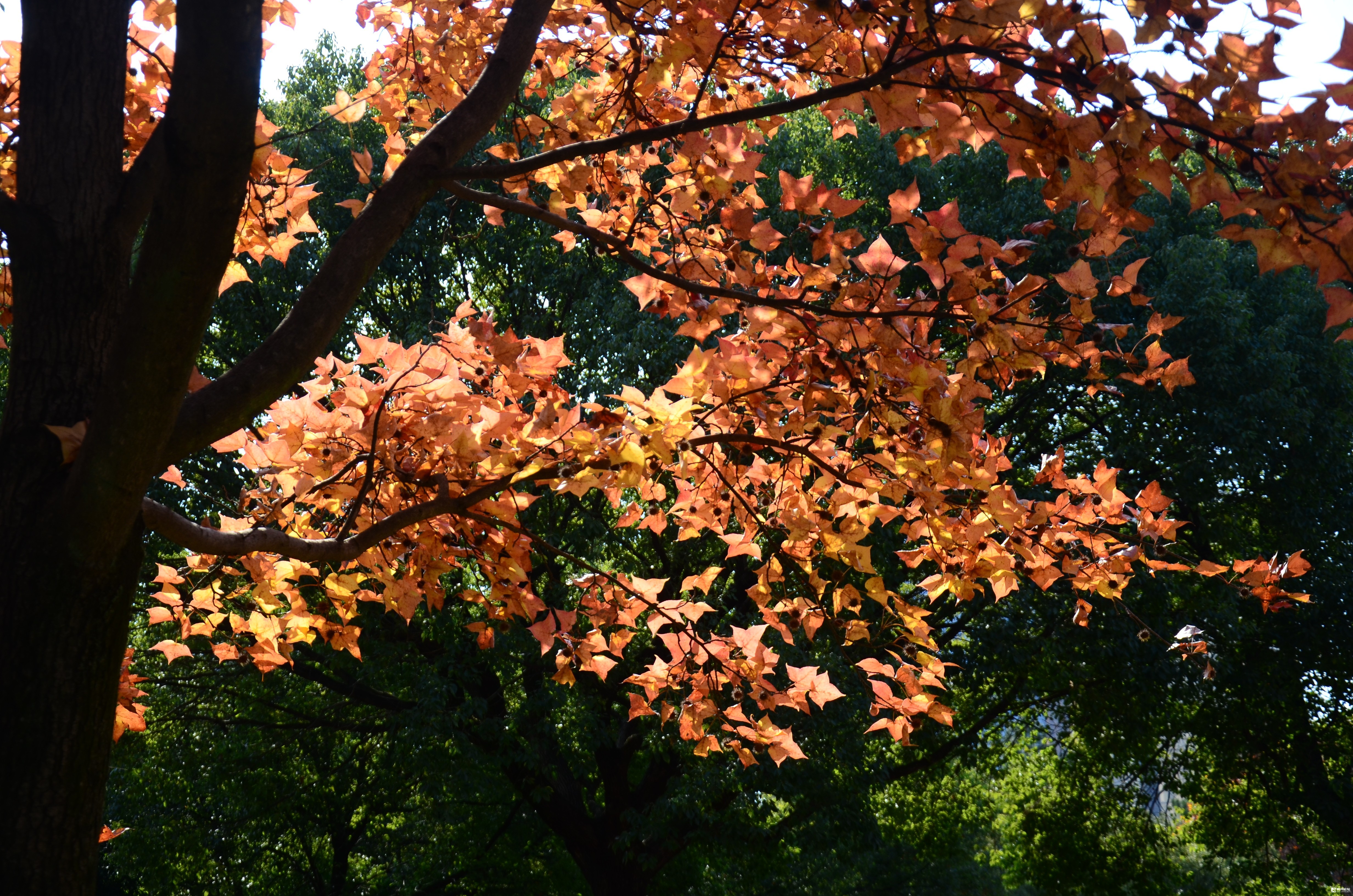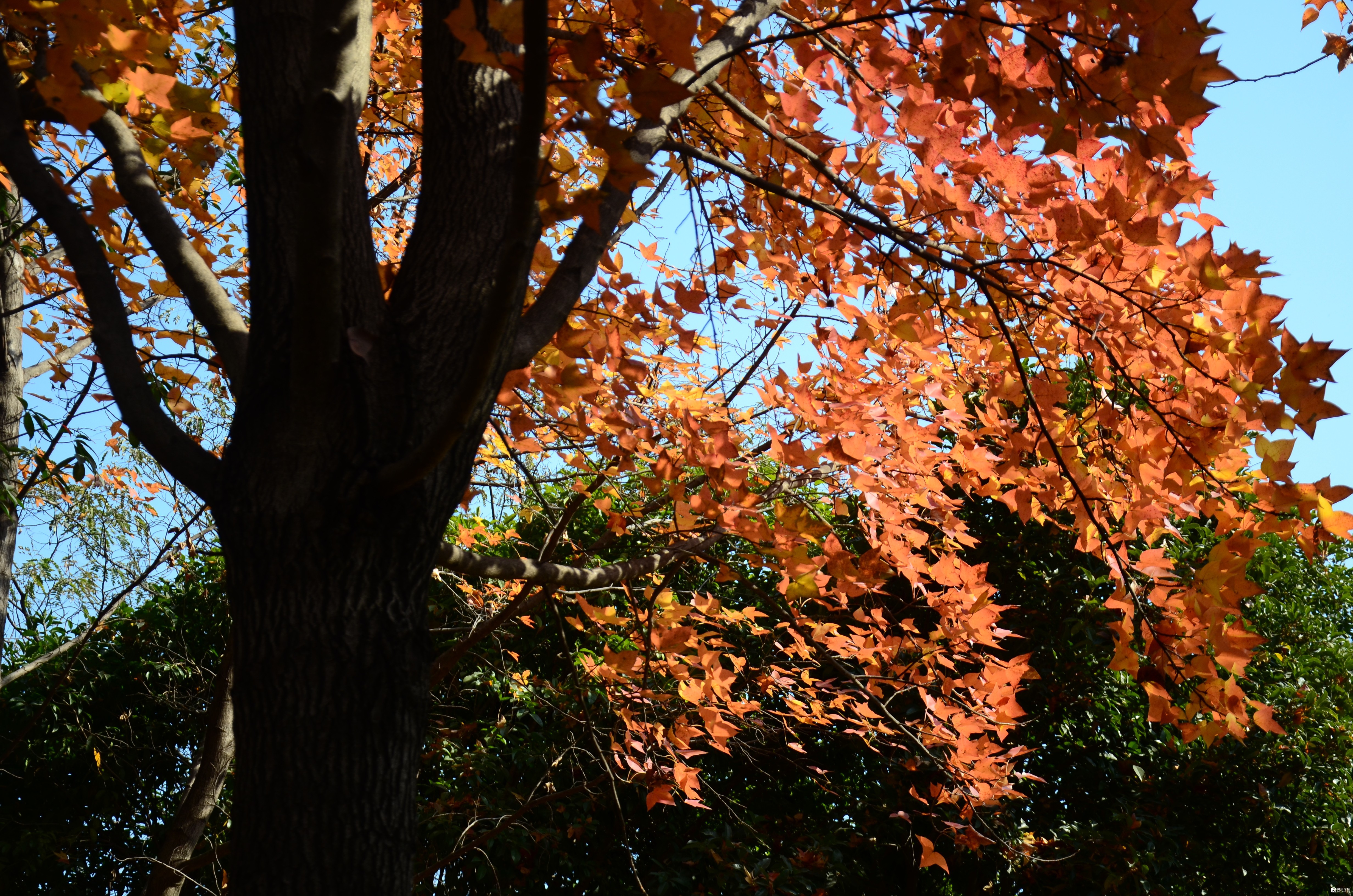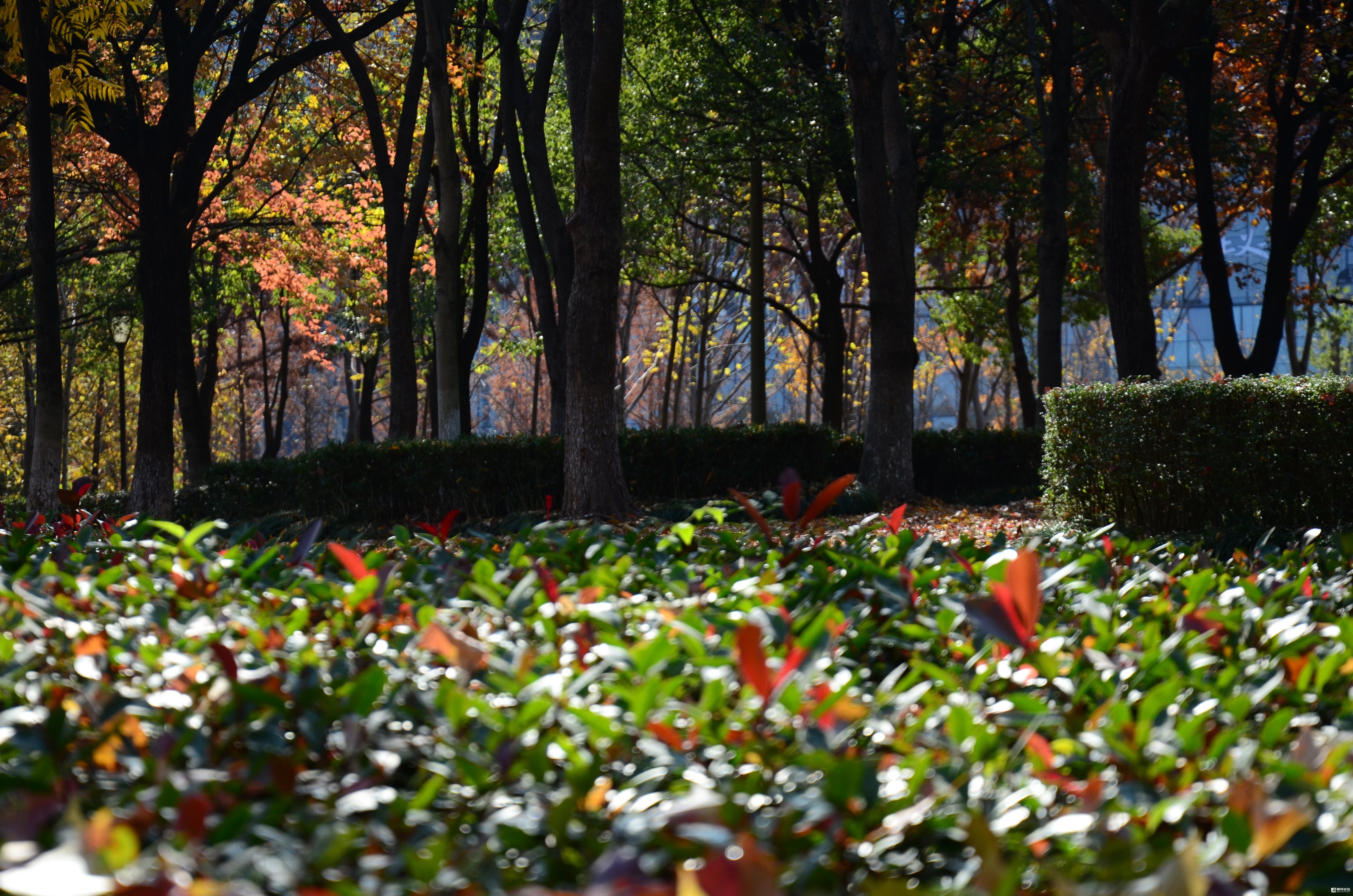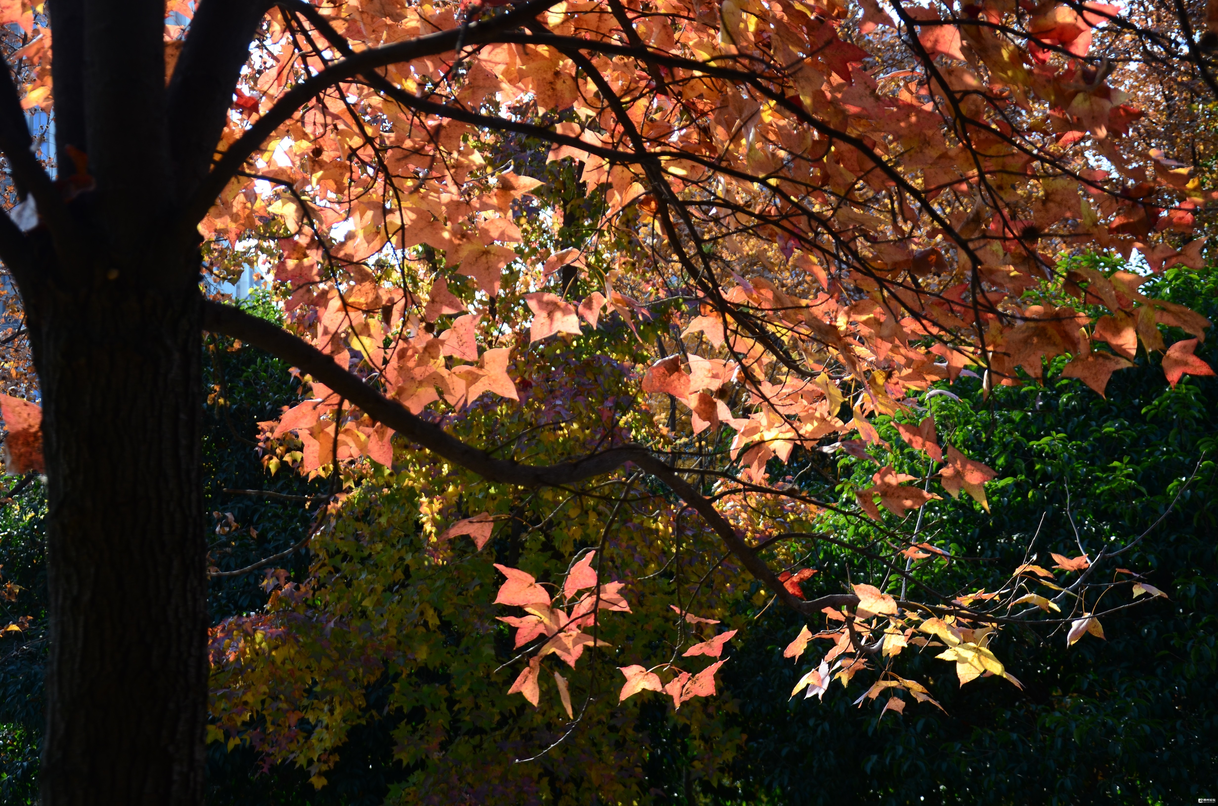 这里是福田公园东南区块,靠近商城大道一侧的那片枫树林,枫叶正红。有微风吹来的时候,枫叶就飘呀飘,飘落在了草地上,已经铺上了厚厚一层。当你轻轻地走过,就会发出沙沙的响声。
