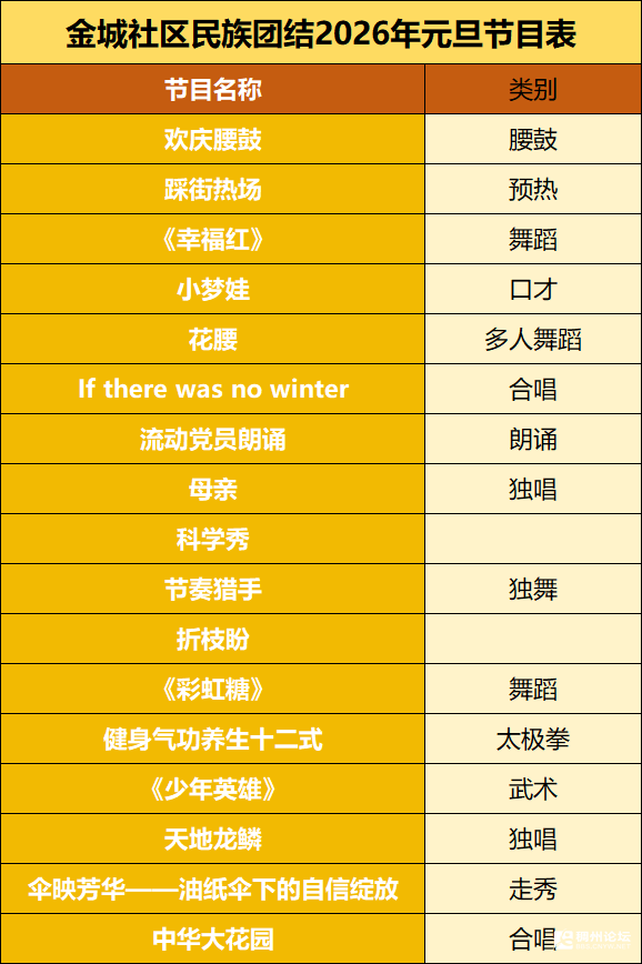 当新年的钟声即将敲响 当多元的音符在此汇聚 这里,有一场专属于金城社区的 温暖相逢 12月28日 金城社区民族团结元旦联欢会 让我们走进金城社区遗安小区广场 邻里欢聚迎新年,同心共筑民族情 后宅街道金城社区邀您 共赴一场元旦团圆盛会 活力舞蹈,跃动新年朝气 刚柔并济,中华武术展风采 深情独唱,唱响团结之声 时尚走秀,融汇多元之美 激昂朗诵,传递“六义”精神 ……