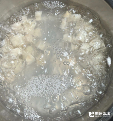 烧一锅开水,把藕丁先下锅汆烫一分钟后,捞出备用。