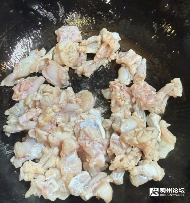 锅烧热放油,把牛蛙下锅翻炒一下,饭店里是开大油锅处理的,家里就煸炒一下,省点油,牛蛙完全变色后盛出来备用。