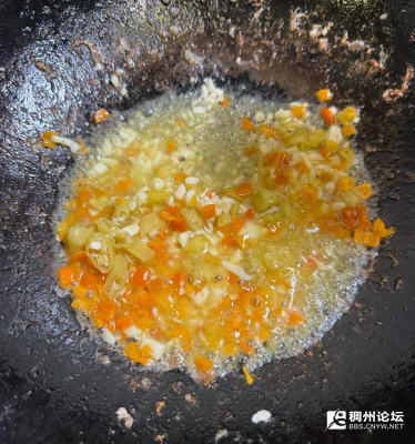 先开中小火,把蒜末、野山椒、黄贡椒下锅煸炒。
