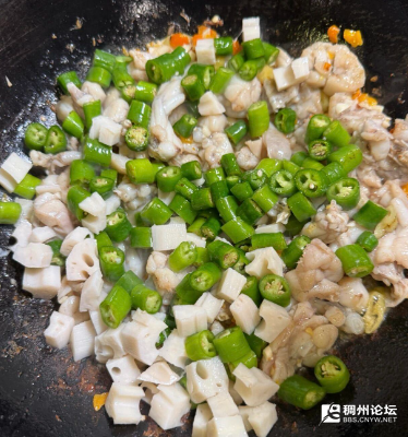 翻炒均匀后,加入少量开水,不要太多,差不多食材的一半就好,加入盐、糖、白胡椒粉调味,开大火煮一会。
