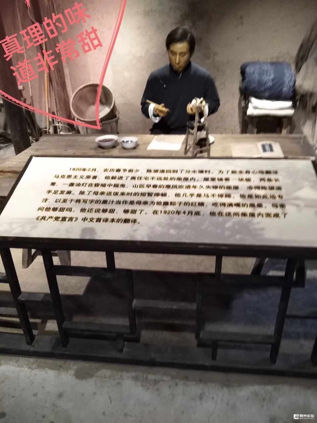 从“魔法”般的蓝色数字的热闹里抽身,我们走进了红色根脉所在地一一分水塘陈望道故居。 认真听完讲解员叙述陈望道先生身居柴房,凝神静思,笔耕不辍,废寝忘食,夜以继日,熬出了首个《共产党宣言》中文全译本;他蘸着墨水的粽子,嚼出了“真理的味道非常甜”的佳话。我们站在老旧的柴房边,好像能摸到先生笔尖的温度,能承接那份穿越了时代的信仰力量,心里充满着对望道先生的无比崇敬。
