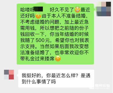 送出去的份子钱收回来了,心里还是感觉挺尴尬的一方面开解自己,确实是至少8年不联系的老同学了,另一方面还是感觉好尴尬呀!!!!!现在还联系的朋友肯定不会发的,去吃过酒席的也不会发,发的都是人没到礼金到的那种,大家也都很理解,整得我更尴尬了!!