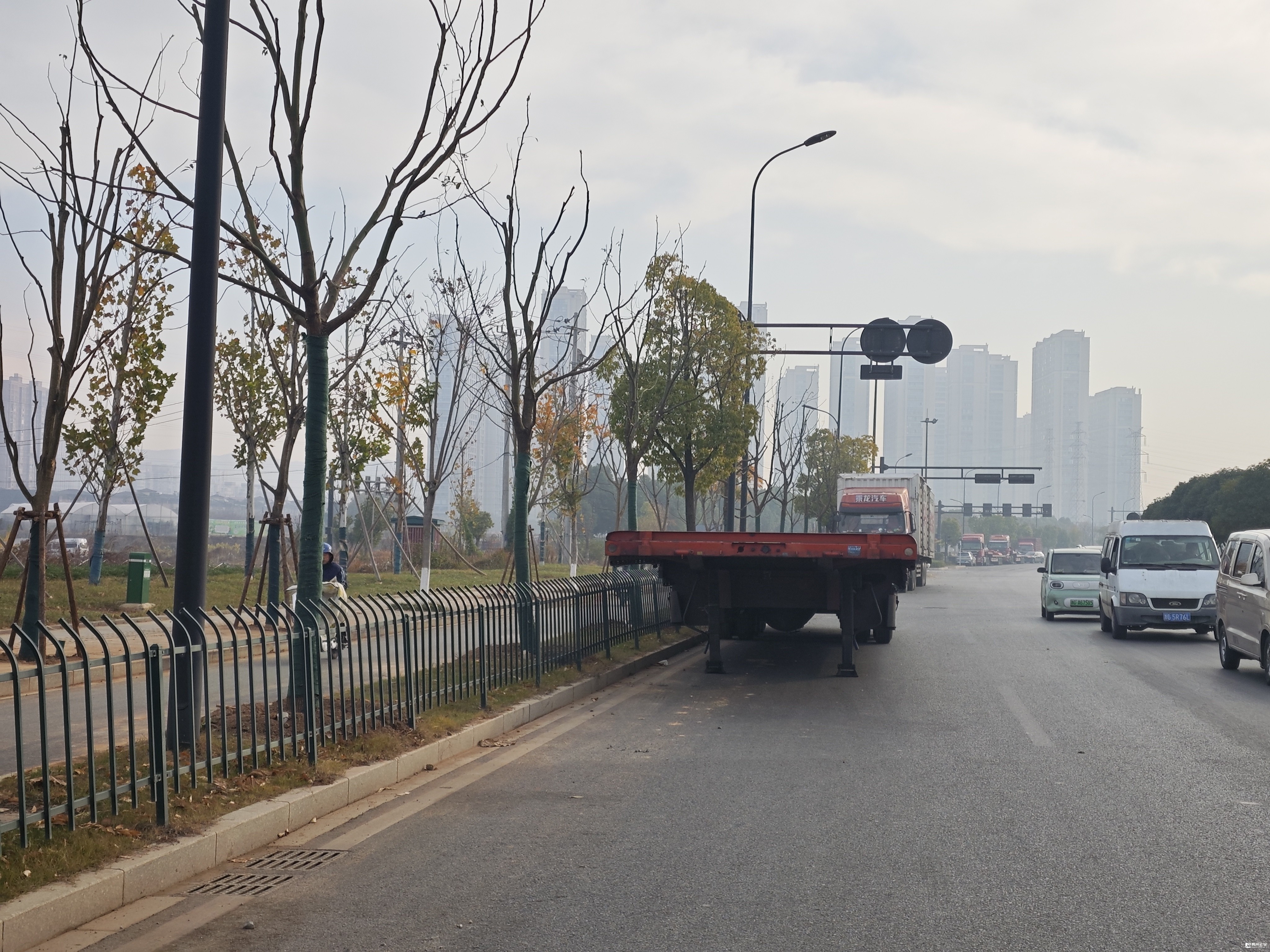 商江大道,阳光大道至通宝路段,主车道上有多辆大挂大货车占道停放,影响道路环境,妨碍交通畅行。