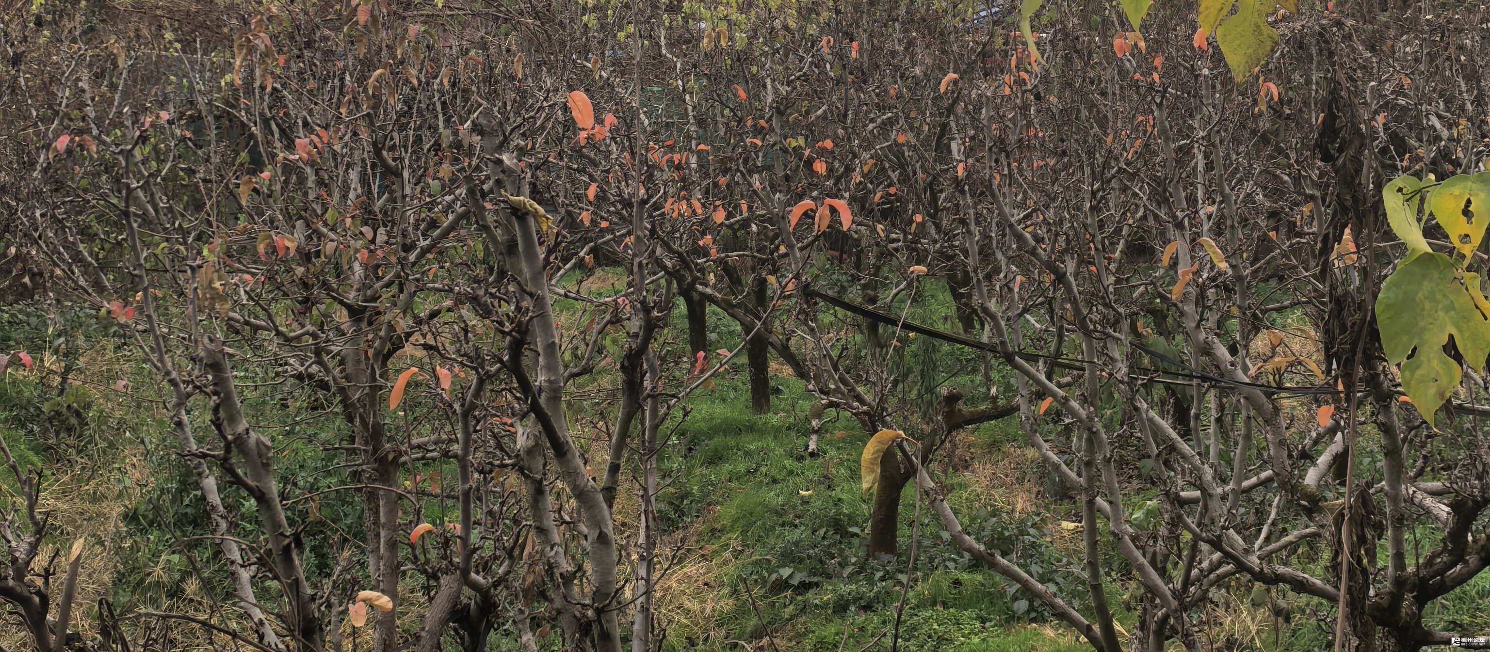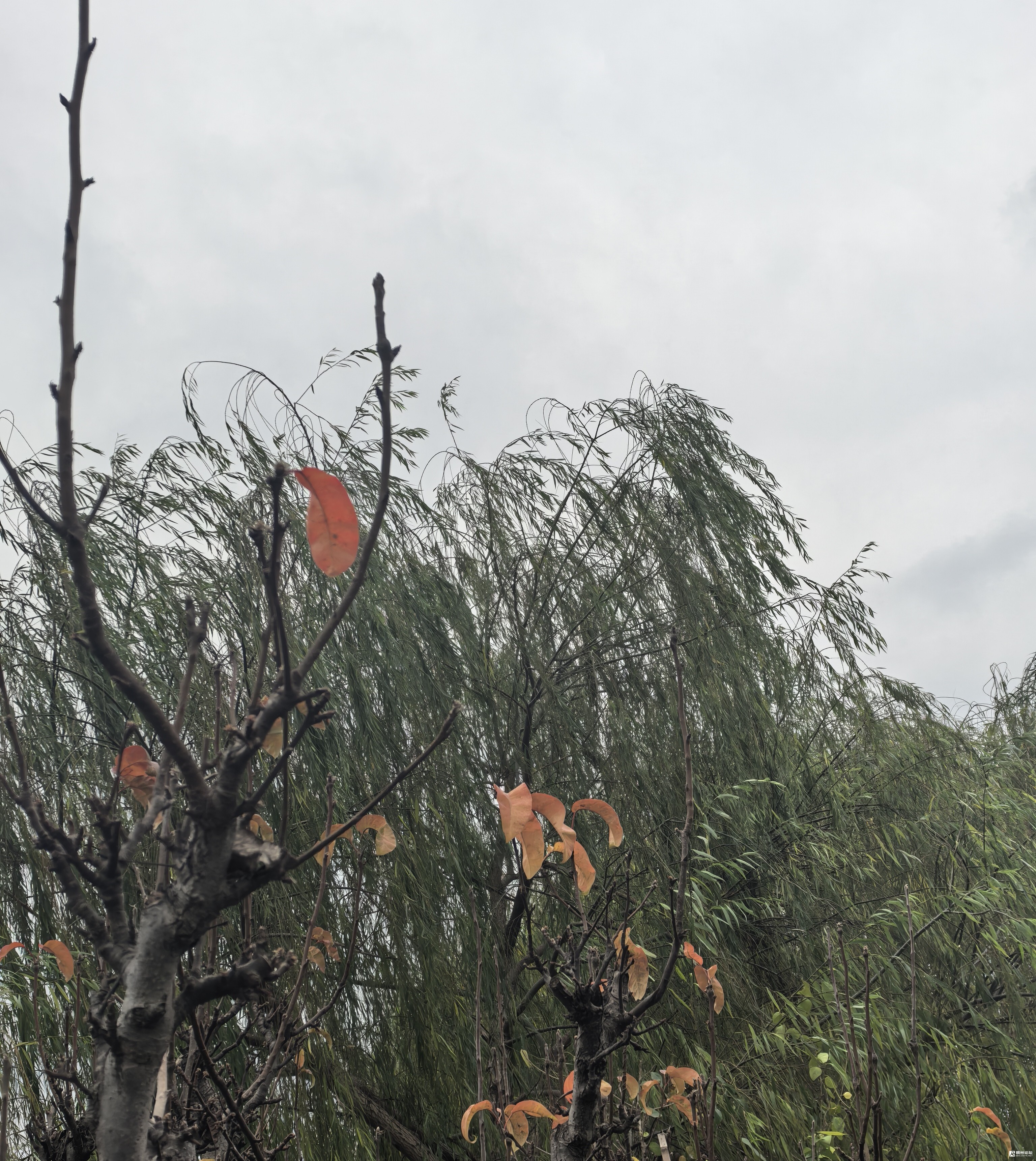 梨树枝上几片红叶,随风摇曳。边上柳枝飘飘荡荡。它们还埋头于小阳春的暖怀中,却不知数九寒天已经悄悄地光临,等待他们的冷酷无情。
