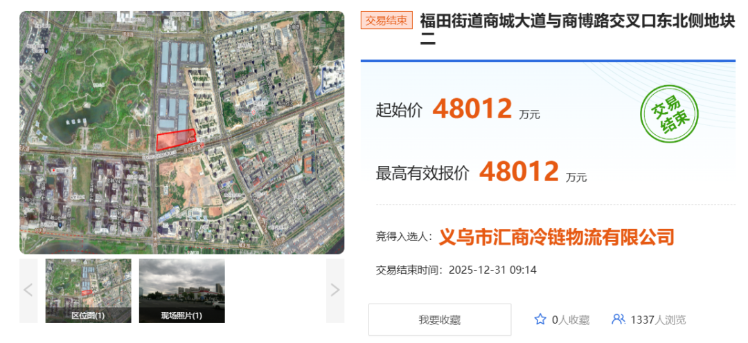 12月31日上午,义乌市福田街道商城大道与商博路交叉口东北侧地块二成功出让,地块成交价48012万元。商城大道与商博路