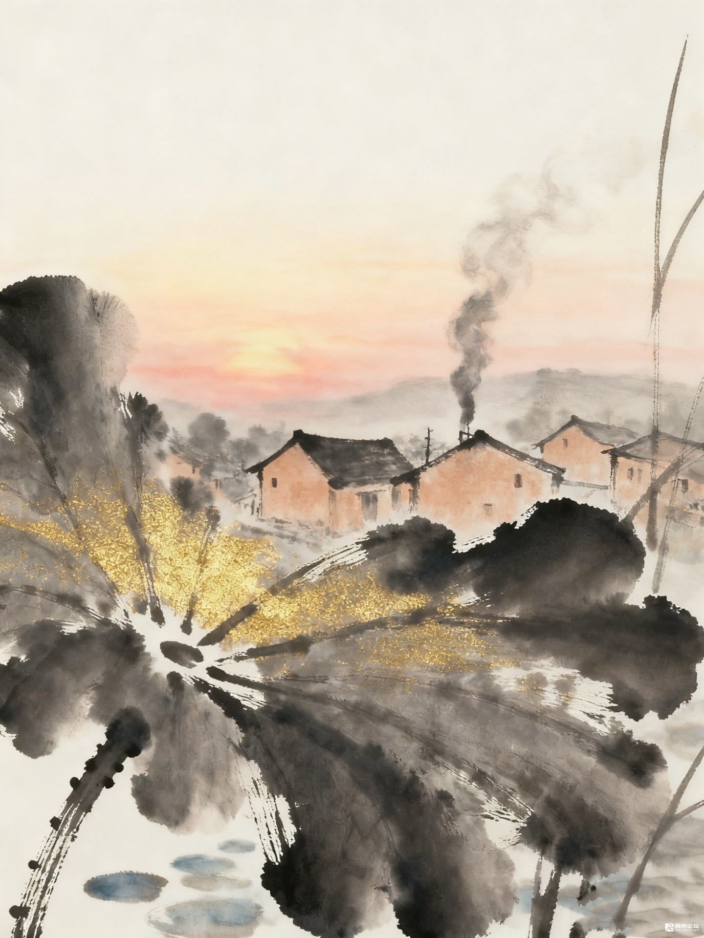 该是灶台烧热了,饭菜香要漫出来了。荷在这儿听了多少年炊烟?从墨色的清晨,到这金粉晃眼的黄昏,它总把自己当画布,把炊烟、日头、屋舍,都轻轻描在上面——原来最家常的暖,是能让水墨也变得温软的。