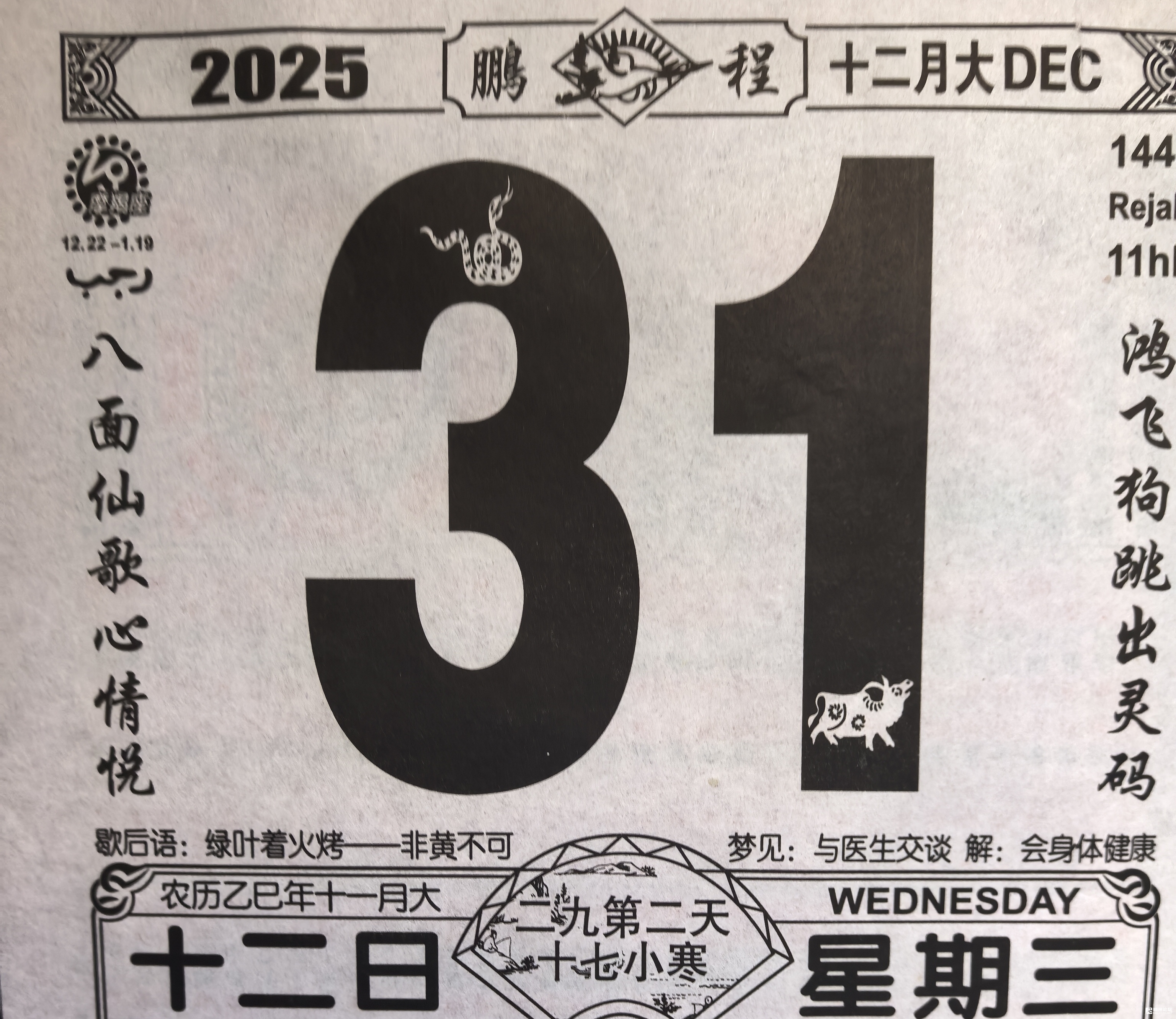 白底黑字的2025年的最后一页撕了,见证了过去一年所有的翻篇。挂上了红红火火的2026年的日历,迎来了喜庆的新一年的第一天。