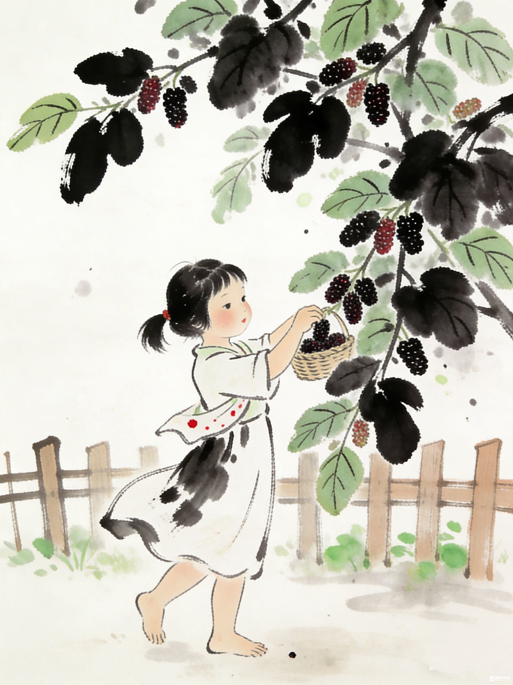 桑叶绿得泼泼洒洒,桑葚紫黑的、红透的,坠在枝上像偷藏的星子。她光脚踩在软泥里,白裙被风掀得鼓起来,竹篮在手里轻轻晃。