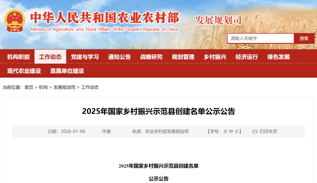 1月6日,农业农村部发展规划司发布《2025年国家乡村振兴示范县创建名单公示公告》,全文如下↓ 贯彻落实党中央、国务院关于推进乡村全面振兴的决策部署,按照中央关于创建示范活动管理的有关要求,农业农村部开展2025年国家乡村振兴示范县创建工作。近期,经地方推荐、专家评审,形成拟纳入2025年国家乡村振兴示范县创建名单(附件),现将北京市顺义区等83个申报单位名单予以公示。公示期为1月6—8日。如有异议,请实名向农业农村部发展规划司反映。反映情况要实事求是,并将证明材料发至xczxc@agri.gov.cn。 联系方式:010—59191681 附件:2025年国家乡村振兴示范县创建名单 农业农村部发展规划司 2026年1月6日 2025年国家乡村振兴示范县创建建议名单 (共83个) 1.北京市顺义区 2.天津市滨海新区 3.河北省石家庄市藁城区 4.河北省安平县 5.山西省汾阳市 6.山西省万荣县 7.内蒙古自治区土默特右旗 8.内蒙古自治区科尔沁右翼前旗 9.辽宁省东港市 10.辽宁省昌图县 11.吉林省长春市双阳区 12.吉林省永吉县 13.黑龙江省嘉荫县 14.黑龙江省穆棱市 15.上海市崇明区 16.江苏省南京市六合区 17.江苏省无锡市锡山区 18.江苏省苏州市吴江区 19.江苏省宿迁市宿豫区 20.浙江省杭州市临安区 21.浙江省宁波市奉化区 22.浙江省乐清市 23.浙江省桐乡市 24.浙江省义乌市 25.安徽省怀远县 26.安徽省当涂县 27.安徽省天长市 28.安徽省阜南县 29.安徽省泗县 30.福建省永泰县 31.福建省三明市沙县区 32.福建省安溪县 33.江西省庐山市 34.江西省安福县 35.江西省婺源县 36.山东省滕州市 37.山东省肥城市 38.山东省五莲县 39.山东省阳谷县 40.山东省巨野县 41.河南省淇县 42.河南省西峡县 43.河南省商丘市睢阳区 44.河南省郸城县 45.河南省济源市 46.湖北省武汉市江夏区 47.湖北省钟祥市 48.湖北省武穴市 49.湖北省恩施市 50.湖北省仙桃市 51.湖南省醴陵市 52.湖南省衡阳市珠晖区 53.湖南省永州市零陵区 54.广东省广州市花都区 55.广东省仁化县 56.广东省梅州市梅县区 57.广东省海丰县 58.广西壮族自治区河池市宜州区 59.广西壮族自治区象州县 60.海南省三亚市崖州区 61.海南省澄迈县 62.重庆市涪陵区 63.重庆市北碚区 64.四川省大邑县 65.四川省富顺县 66.四川省梓潼县 67.四川省仪陇县 68.贵州省开阳县 69.贵州省玉屏县 70.云南省凤庆县 71.云南省元谋县 72.西藏自治区曲水县 73.西藏自治区墨竹工卡县 74.陕西省铜川市印台区 75.陕西省眉县 76.陕西省吴堡县 77.甘肃省金昌市金川区 78.甘肃省渭源县 79.青海省河南县 80.宁夏回族自治区隆德县 81.新疆维吾尔自治区沙雅县 82.新疆维吾尔自治区裕民县 83.新疆生产建设兵团新星市 |