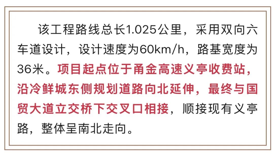义亭路作为义亭镇“一高两快四纵三横”的镇域路网体系中的城市主干路之一,项目建成后将贯通甬金高速与国贸大道,提升甬金高速公路对地方的服务能力,同时为国际冷鲜城的冷链物流运输提供强有力的交通支持。 |