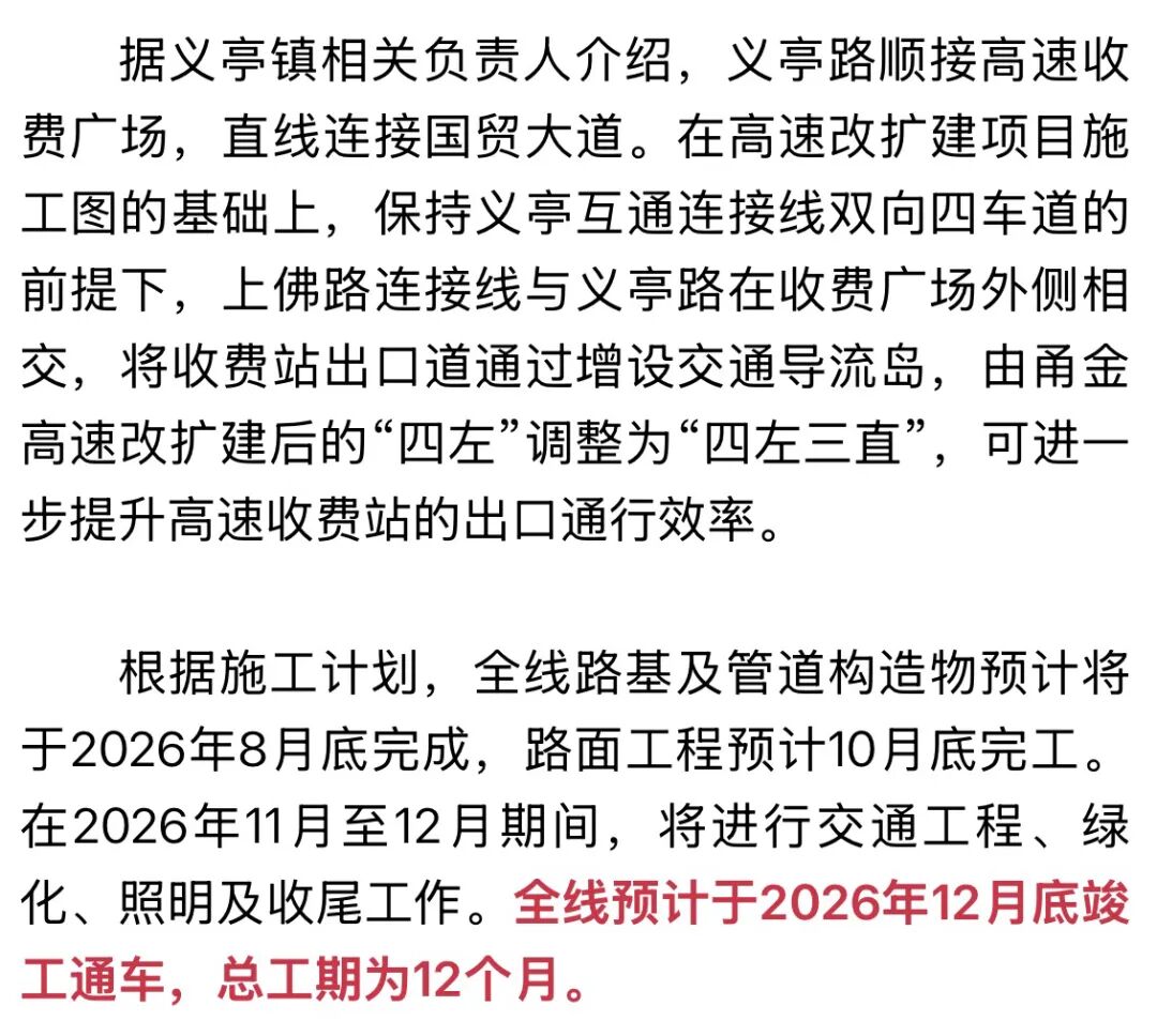 该工程主要包含 “义亭路主线”建设 与“上佛路连接线拓宽改造” 两大部分 自2026年1月起 路基、排水与防护设施、管道等 构造物工程已陆续展开