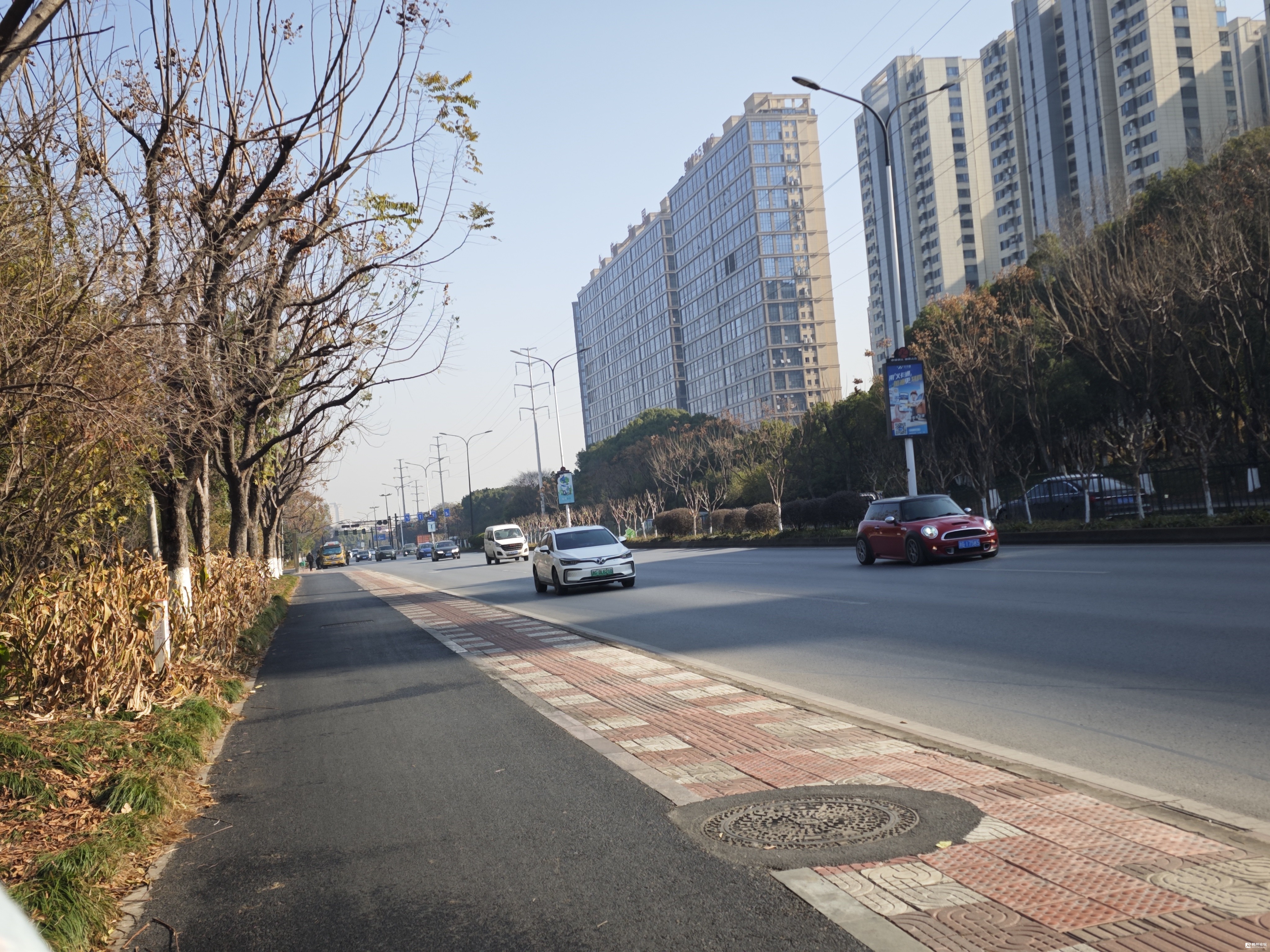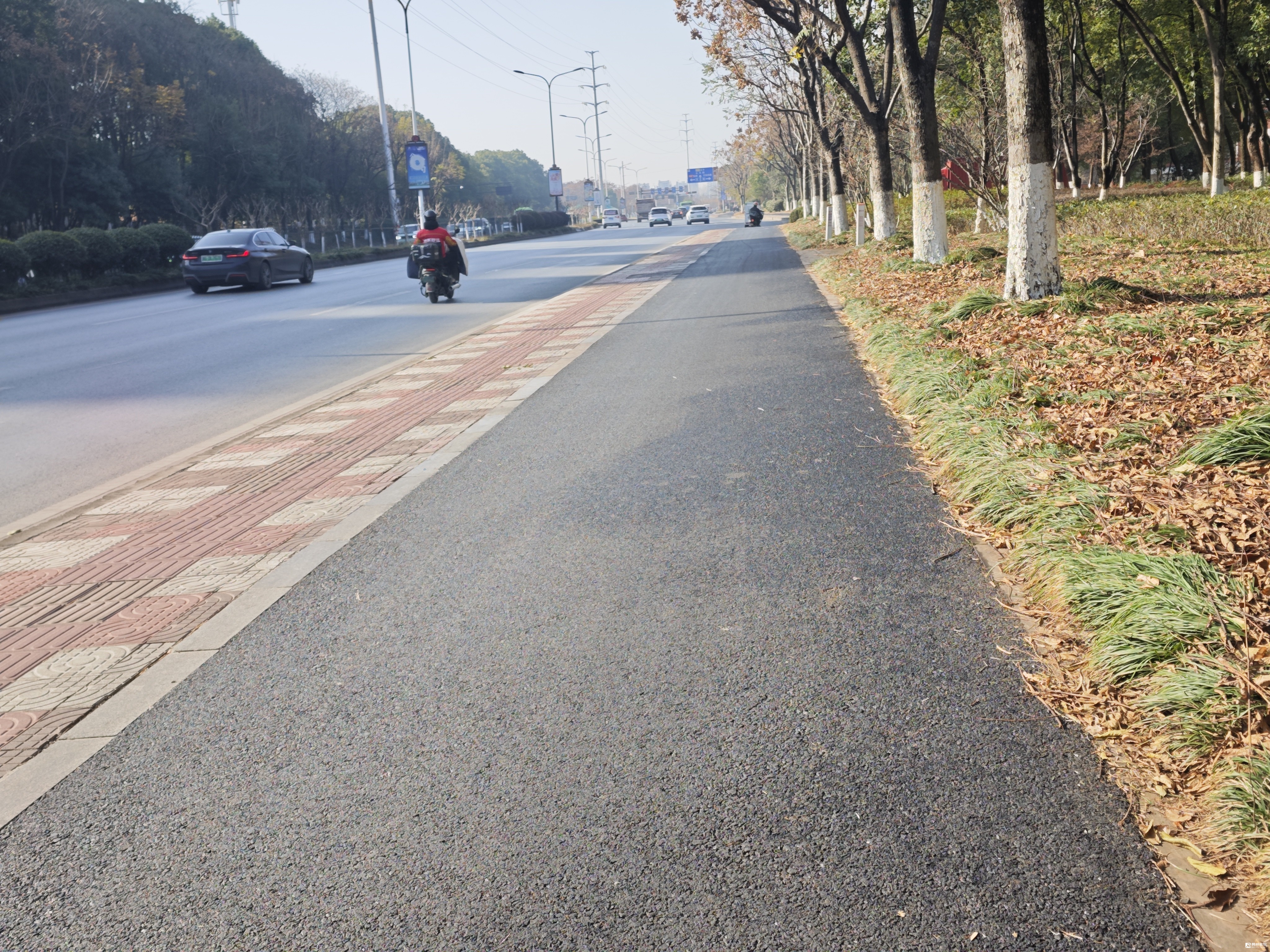 南山路,宗泽路至宾王路段的骑行道,重新铺设了沥青路面,昔日偶有的凹陷路面不见了,接缝处也作了必要的衔接提升,骑行体验有了质的飞跃。