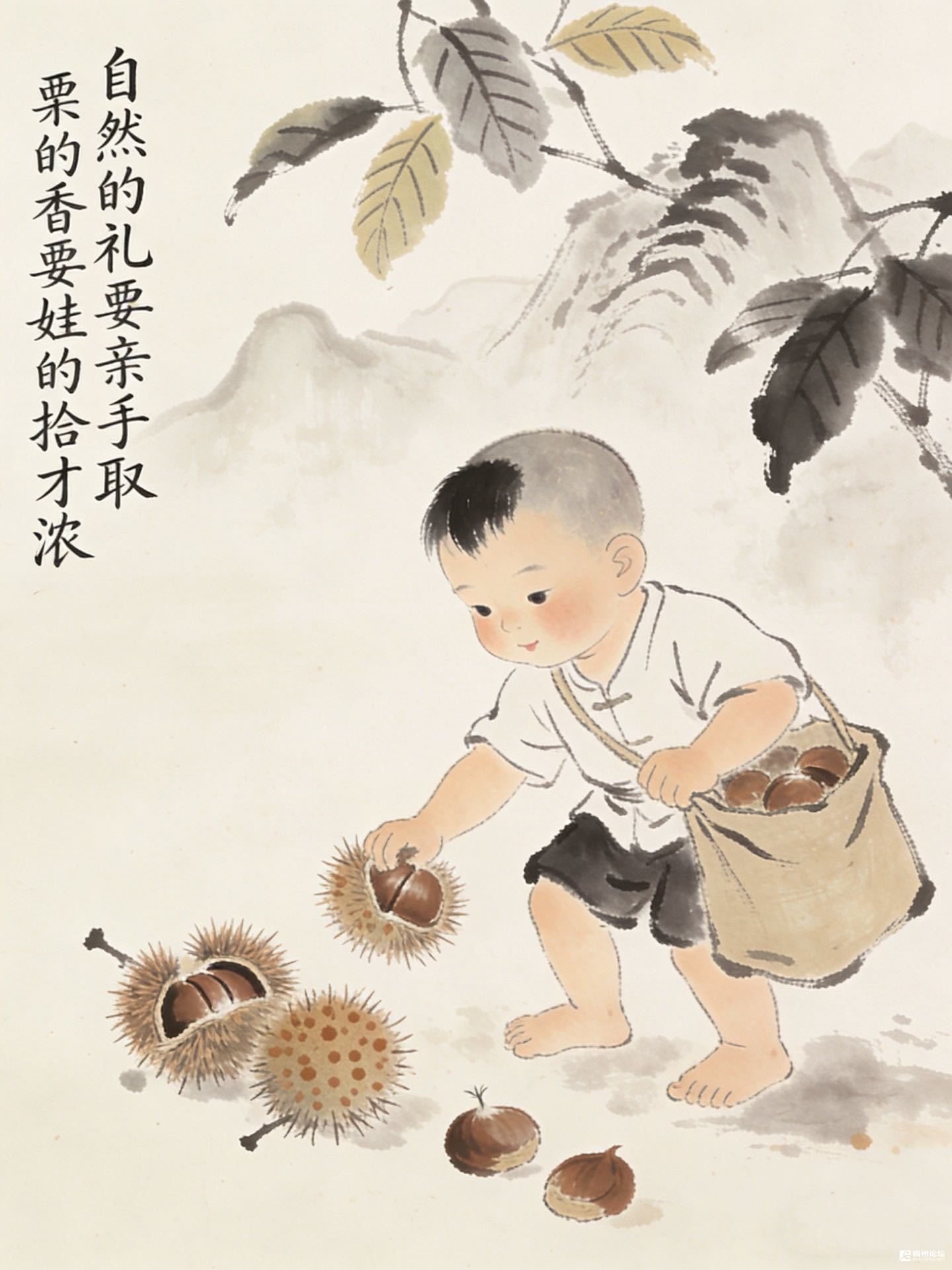 叶子在枝上绿得发沉,山风过处,簌簌落了几片。他才不管这些,眼睛只盯着地上的毛栗球,小手伸出去,指尖碰着刺,缩了一下,又大胆拢过去——要把那褐亮亮的栗肉,稳稳放进篮里。