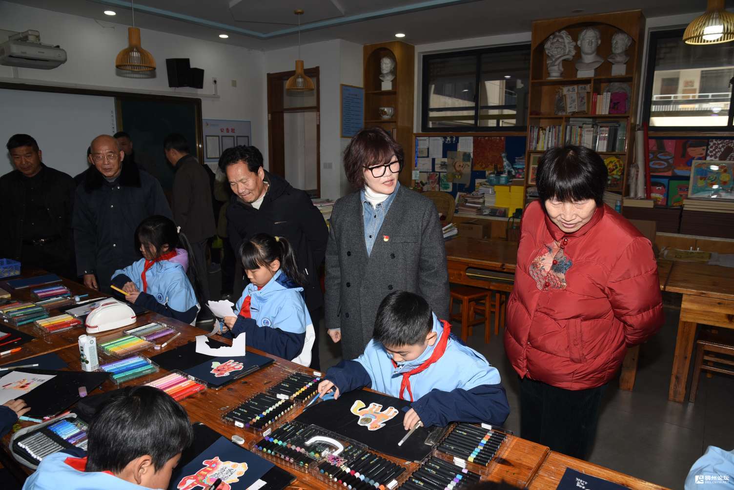 1月11日下午,湖门小学的农民画画室里暖意融融,色彩斑斓。