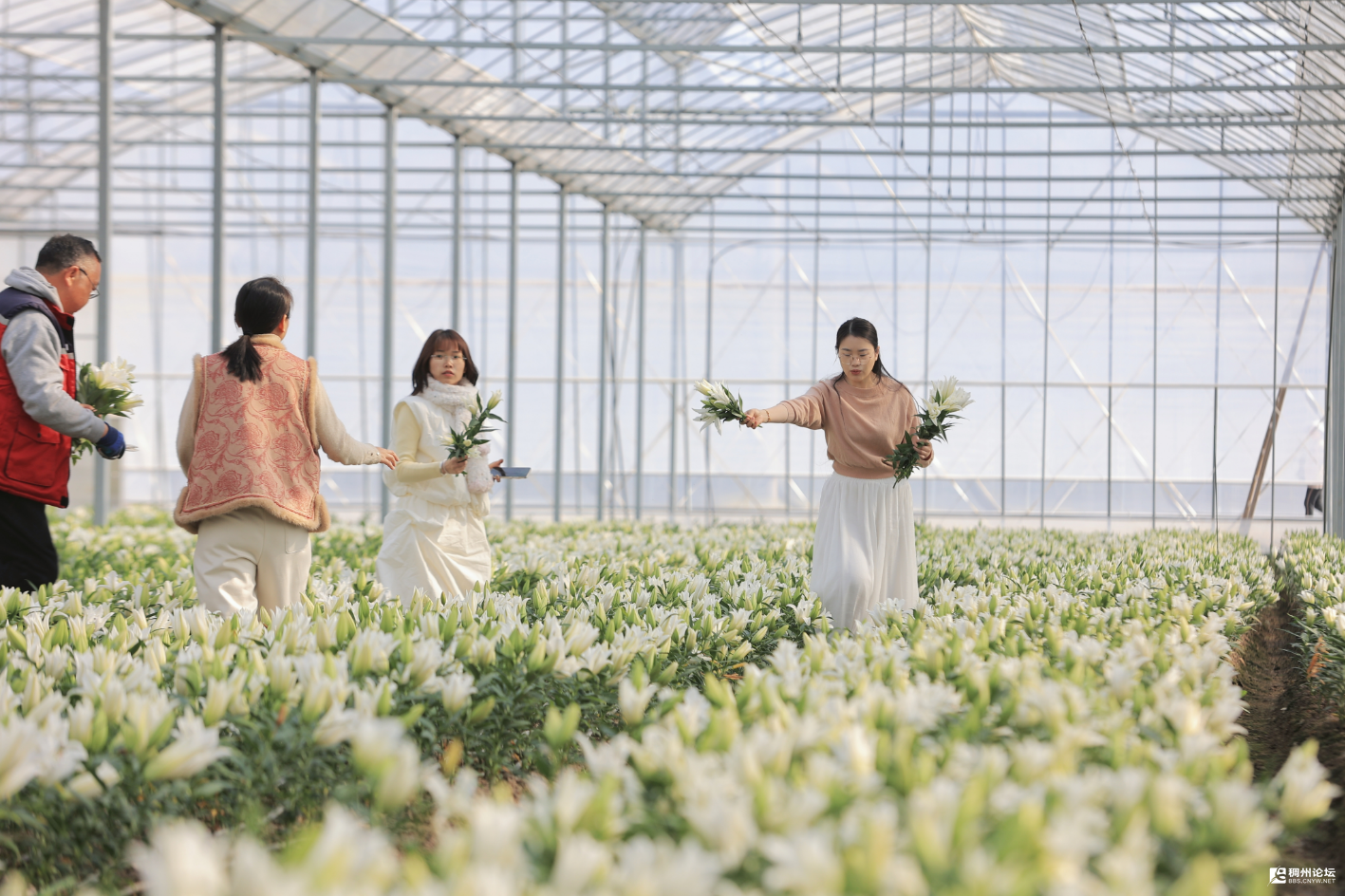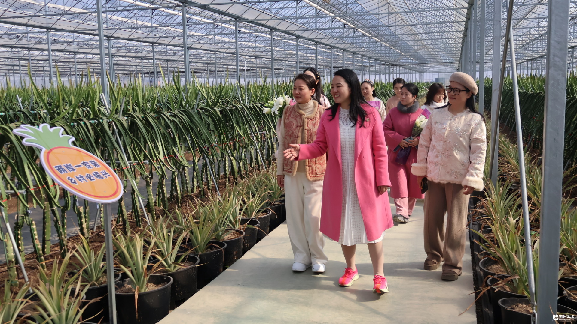 在园区工作人员的引导下,妇联代表们先后走进百合花种植大棚与火龙果智慧种植基地。大棚内,一朵朵娇艳的百合花竞相绽放,清晨的露珠点缀其间,尽显生机与活力。据介绍,该园区百合花日均采摘量达400至500株,亩均产值可达8万元,通过全产业链运营将“美丽资源”转化为“美丽经济”。在火龙果基地,5G智慧大棚的科技感令人眼前一亮,水肥一体化系统、温光水精准调控设备等智能化设施,打破了传统农业“看天吃饭”的局限,将火龙果传统生产周期大幅优化,实现提质增产。代表们驻足观察、拍照打卡,近距离感受智慧农业从种植到产出的全流程创新。