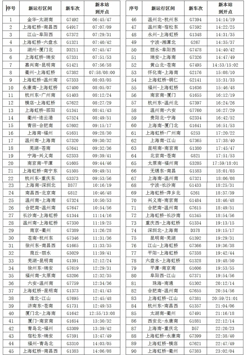 另外,深圳东—上海松江T212次,改为上海南终到,车次改为D22次;杭州—武昌Z47次,改为汉口终到,车次改为D47次;重庆北—上海松江Z257次,改为上海南终到,车次改为D57次;上海松江—武昌Z27次,改为上海南始发、汉口终到,车次改为D107次;上海松江—广州白云T169次,改为上海南始发,车次改为D169次。