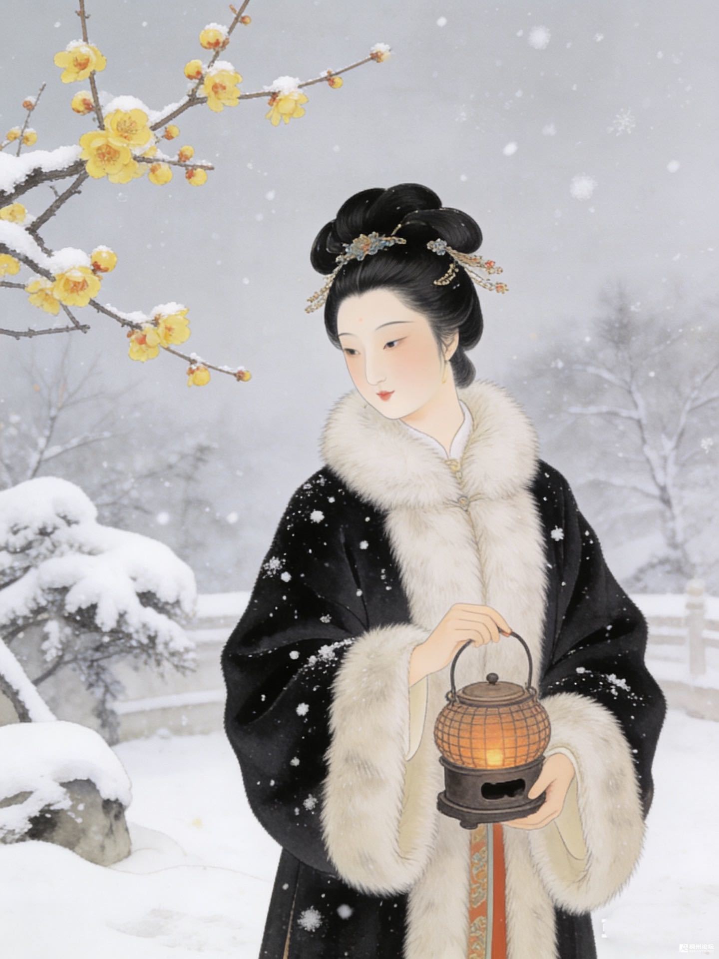 梅枝上的雪簌簌抖,黄花儿却挺得精神,像谁把碎金嵌在了冰棱里。她停在这儿,不是为了看梅,也不是为了赏雪,就是觉得灯的暖、雪的凉、梅的香,凑在一块儿,把这日子填得满满当当的——比待在屋里,听炭火哔剥响,要有意思多了。