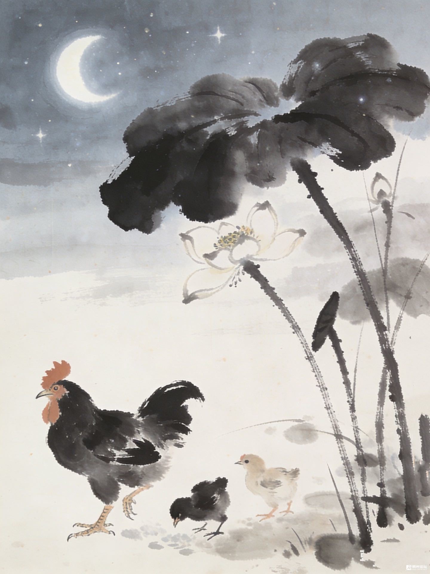 墨荷把夜的凉都兜住了,月芽儿从叶缝漏下光,像谁撒了把碎银。鸡妈妈步子稳稳的,小黑鸡和小黄鸡在脚边啄,倒像是把墨色的荷影,当成了能翻出虫儿的软地。