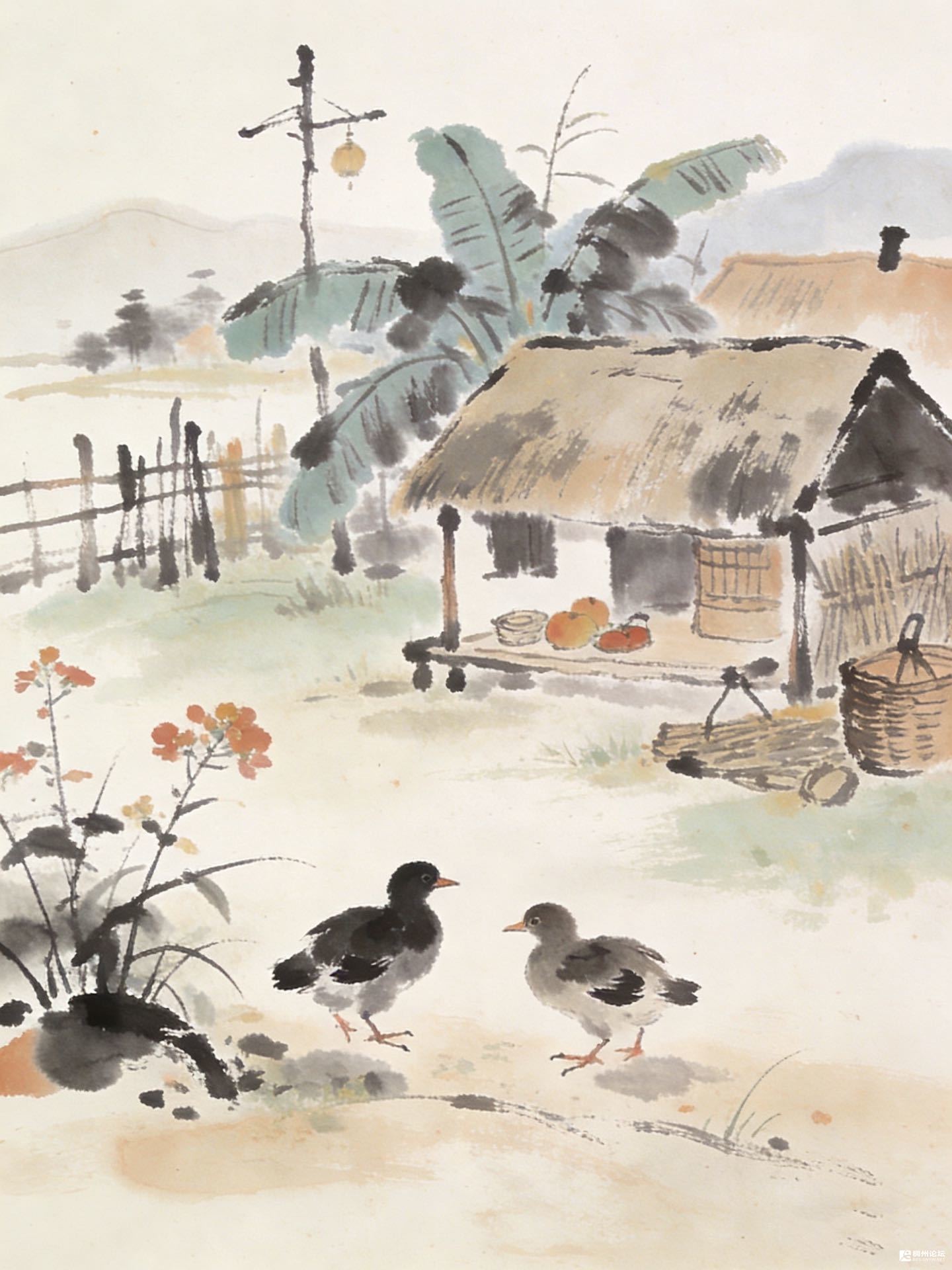 茅檐把日头滤得温软,竹筐边的木柴还带着树的潮气。两只雏鸡歪着头对望,像在拿嫩黄的喙,啄破这水墨般的静。