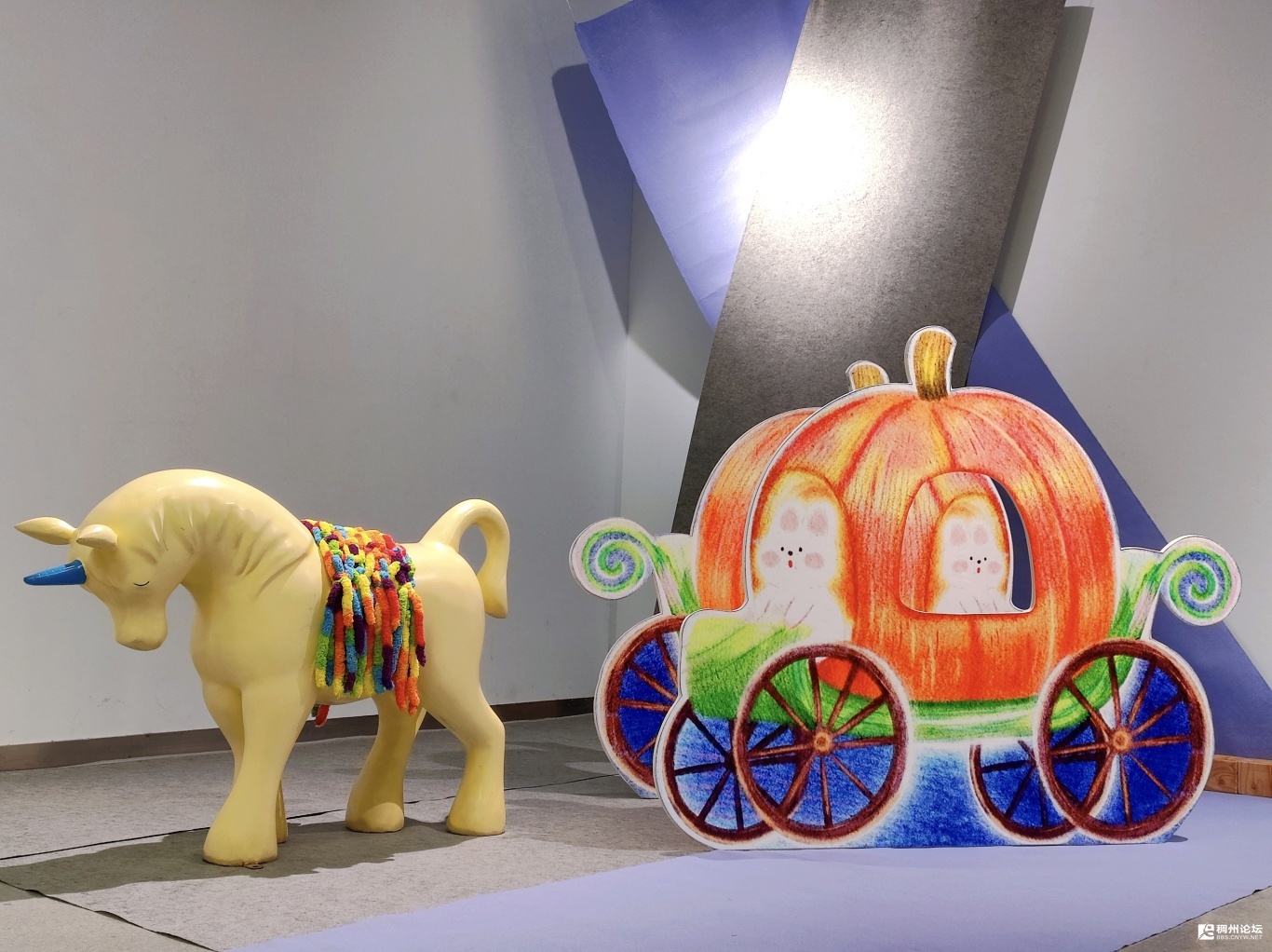 中班孩子的创作,是创意碰撞与集体成长的奇妙旅程。孩子天生拥有发现美的眼睛,更是天生的美的呈现者。我们率先开启“小镜头里的大世界”摄影活动,孩子们化身小小摄影师,穿梭在校园角落,捕捉到“带着刘海的小马脸”“圆滚滚的小屁股”等充满童真的瞬间。这些稚拙的摄影作品,与大师笔下奔腾的骏马、静谧的驿马佳作并置展厅,两种截然不同的审美表达碰撞出奇妙火花,孩子们在对比中惊呼:“原来美可以有这么多样子!”展厅里最震撼的,莫过于那幅气势恢宏的百马图——这是布艺主题课程的延伸,更是全班孩子的集体结晶。从独立创作每一匹布艺小马,到齐心协力将小马逐一拼接成百马奔腾的壮阔画面,孩子们围在旁侧,眼中满是震撼:“原来我的小马和大家的放在一起,能变成这么棒的作品!”一旁矗立的彩色柱子,也是孩子们的创意杰作,他们或选择与小马一致的色彩,或大胆涂鸦彩虹色系,这些“成长的灯塔”,见证着他们感知美、表达美的每一步勇气。