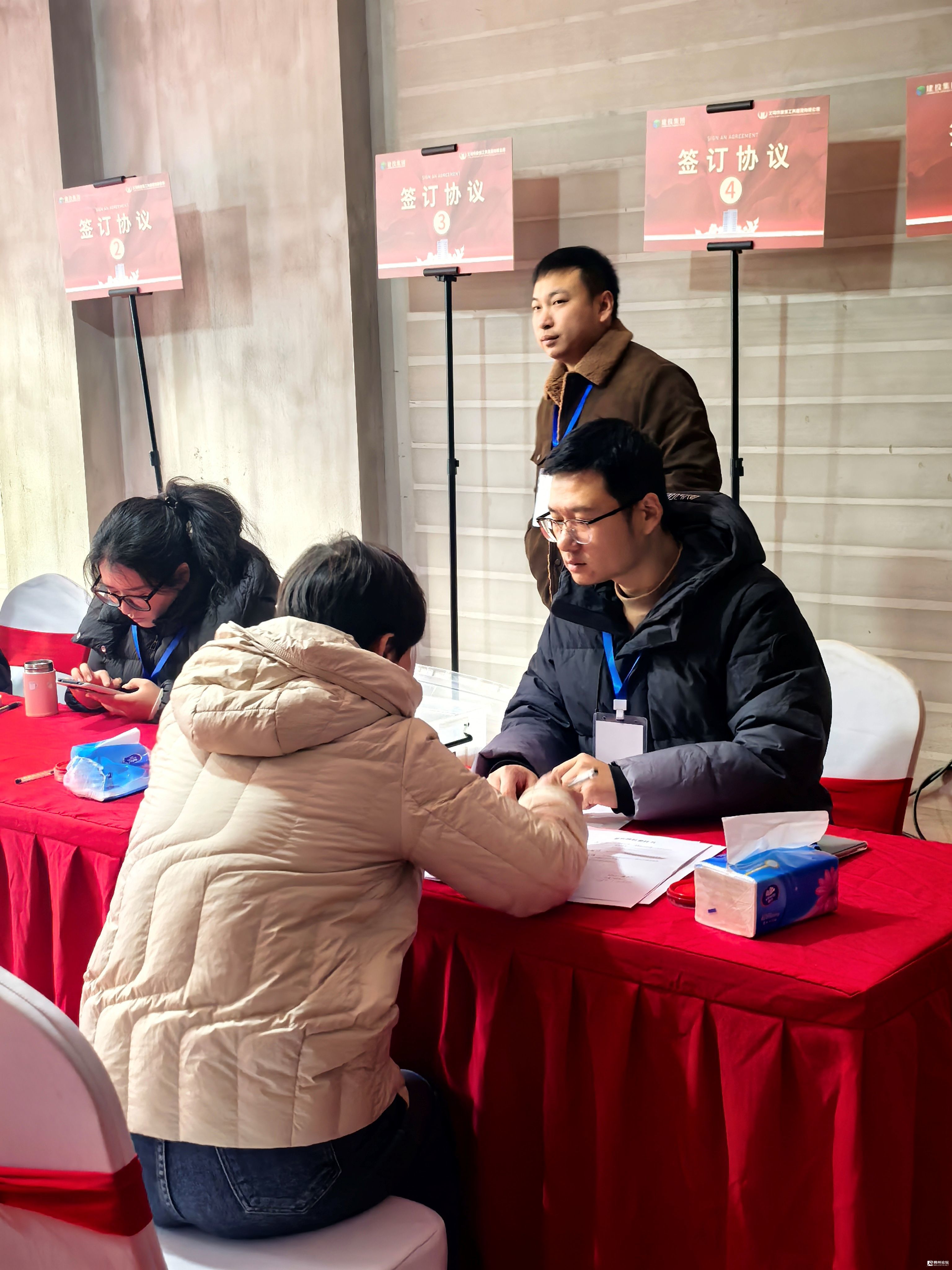 本次交付时间为1月23日至27日,计划交付住宅1294套。1月23日一早,龙海家园北区交付现场早已人头攒动,每一位业主的脸上都写满对未来生活的期盼。尽管天气严寒,但交付现场却暖意融融、秩序井然。为提升交付效率、确保业主收获贴心舒适的收房体验,建投集团严格遵循“建投交付标准”,统筹设置协调、结算、签约等共计8个专项服务小组,投入60余位具备丰富交付经验的工作人员,全面落实岗位职责。各小组职责清晰、配合紧密,从财务结算、协议签署、水电表过户,到钥匙领取、新房验收,全流程均有专人提供细致、周到、专业的服务,全力保障交付流程顺畅有序,让每一位业主都能感受到便捷与安心。