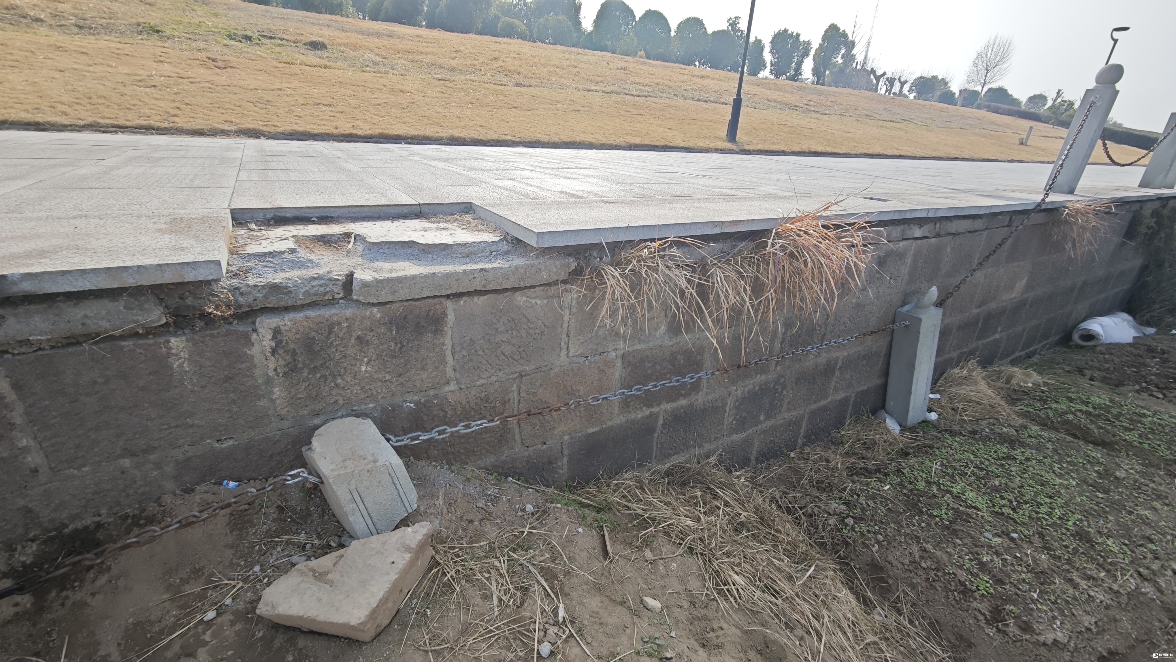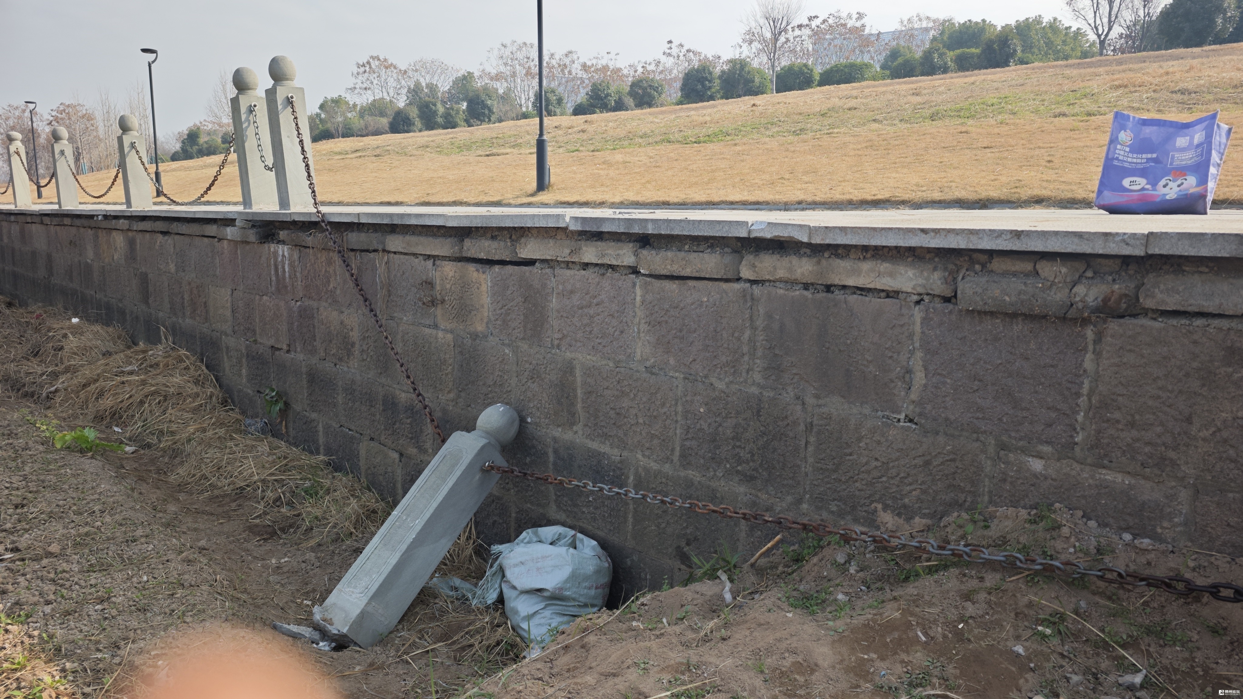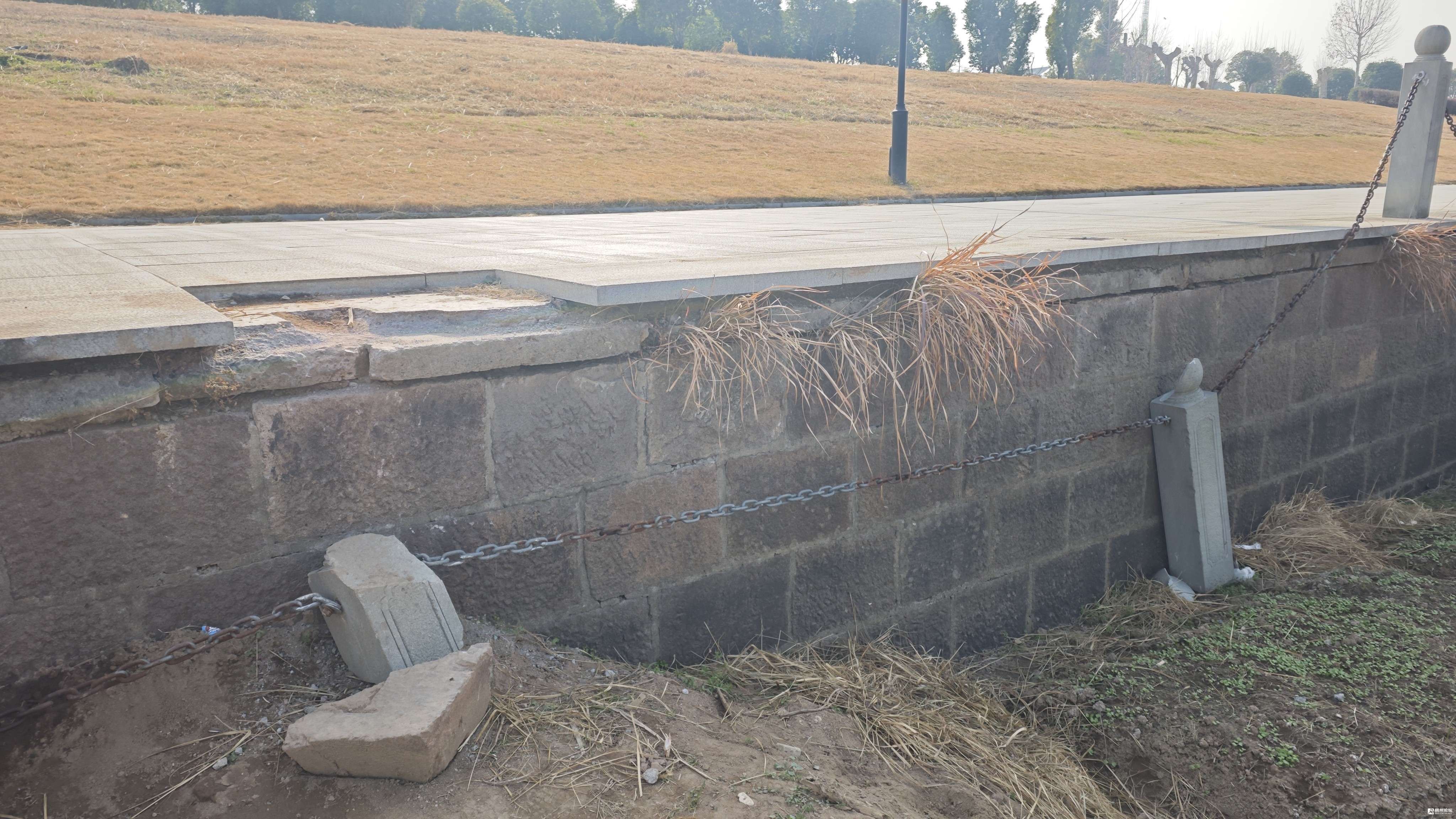 “中福广场”对岸,江滨游步道,有四段12米青石柱和铁链构建的护栏,被人为损毁。