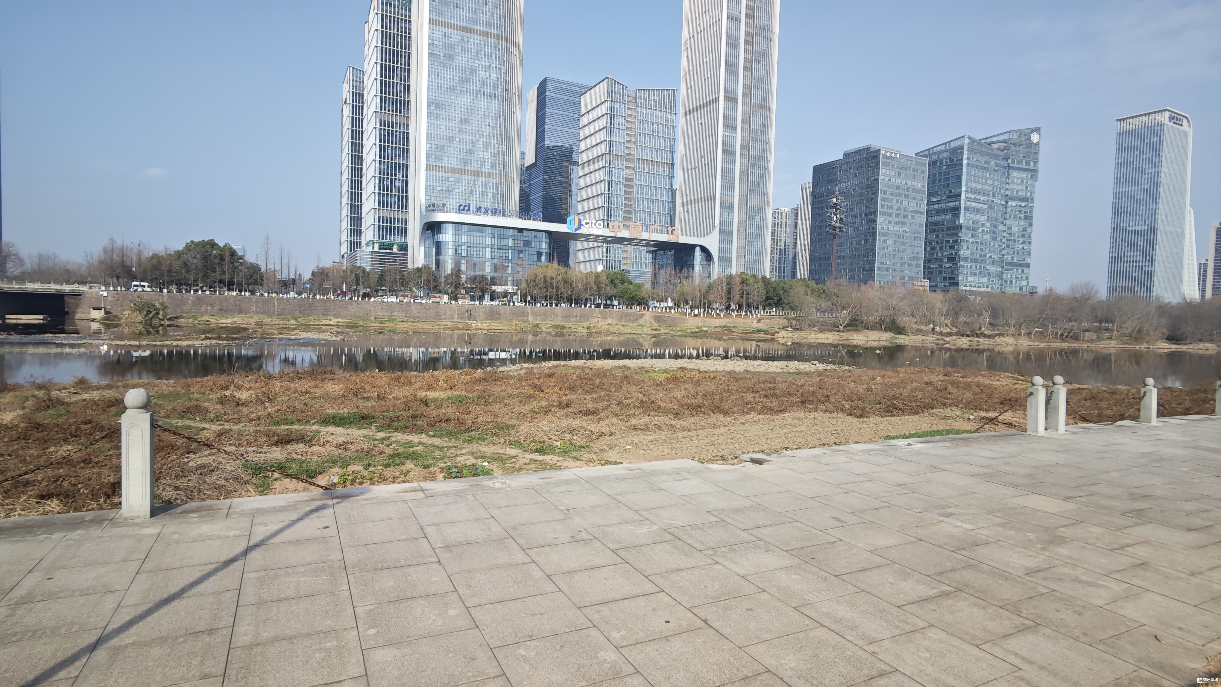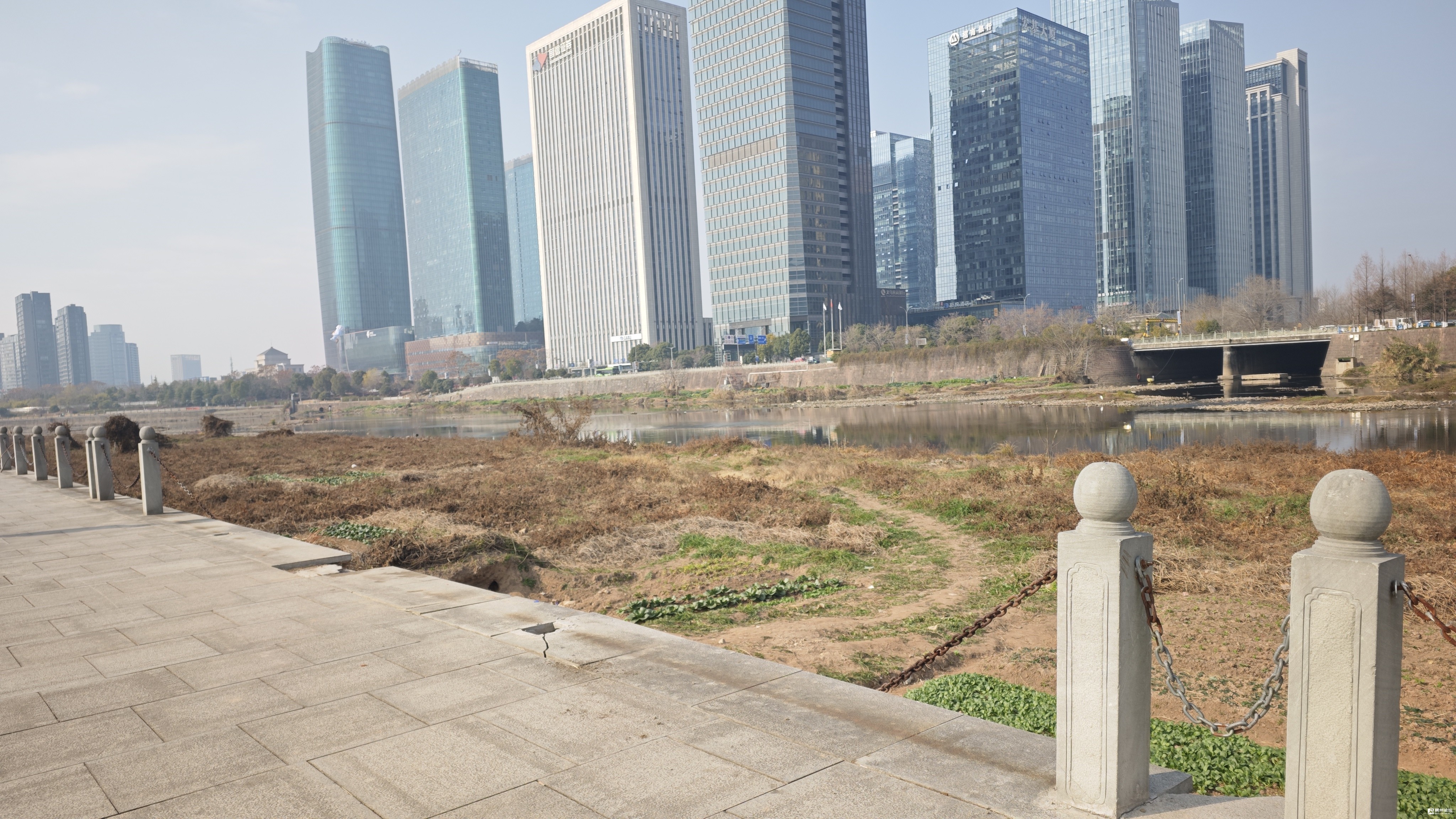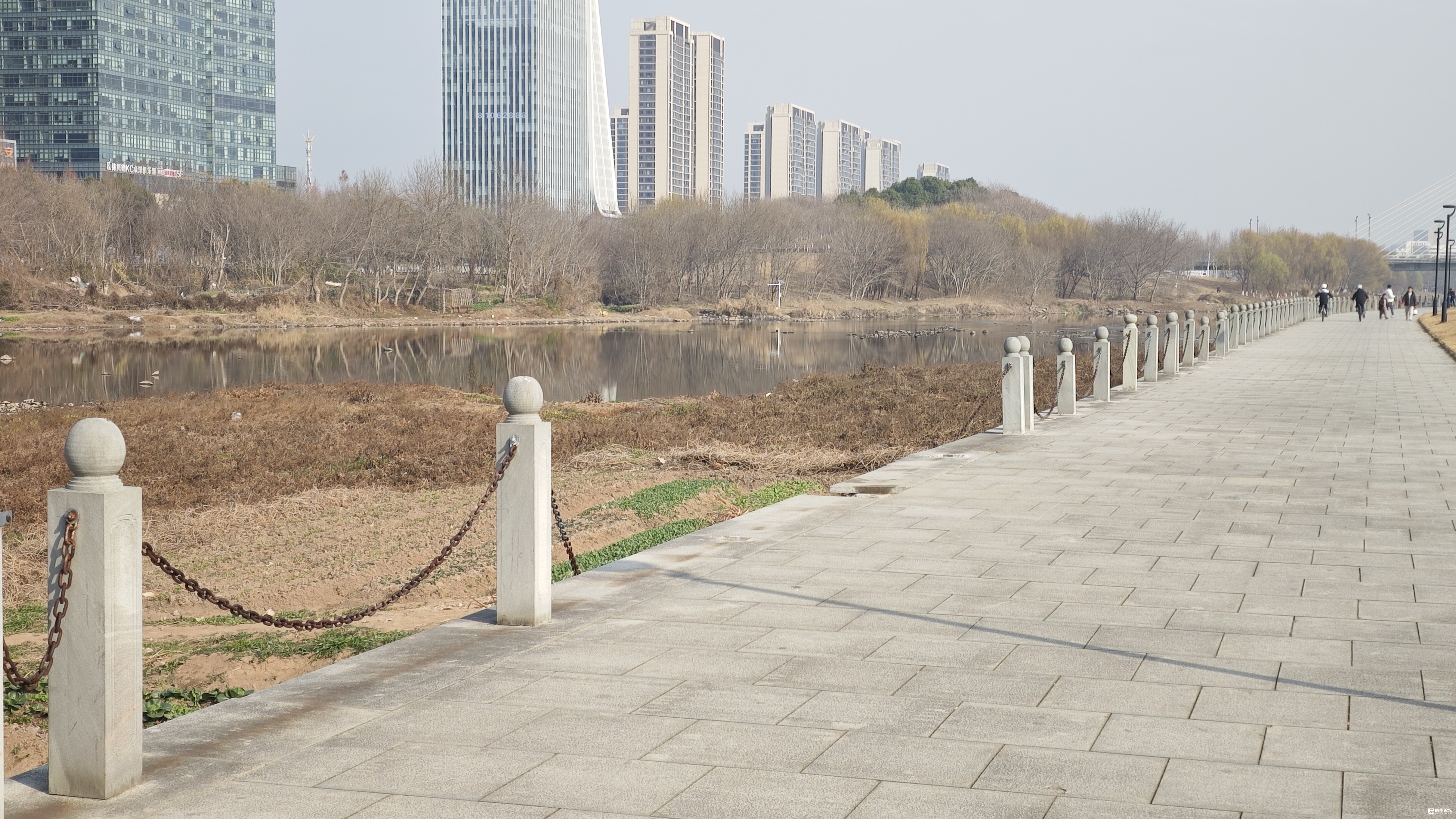 “中福广场”对岸,江滨游步道,有四段12米青石柱和铁链构建的护栏,被人为损毁。