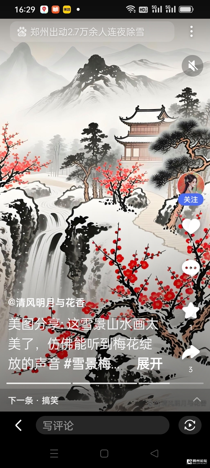 滿山,满坡的雪,潺潺的小溪水,两岸的青松,红梅,傲霜斗雪,灿烂生辉。