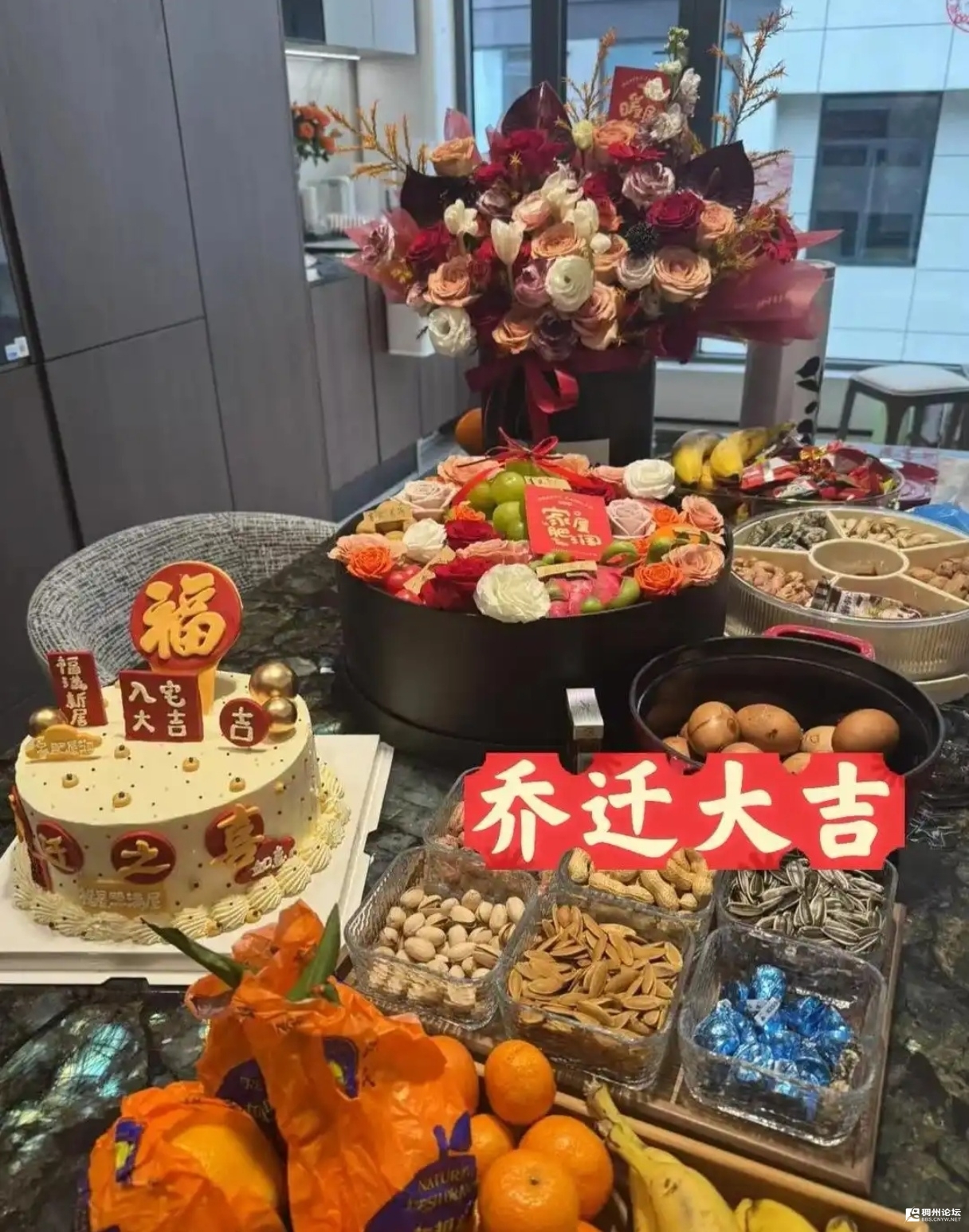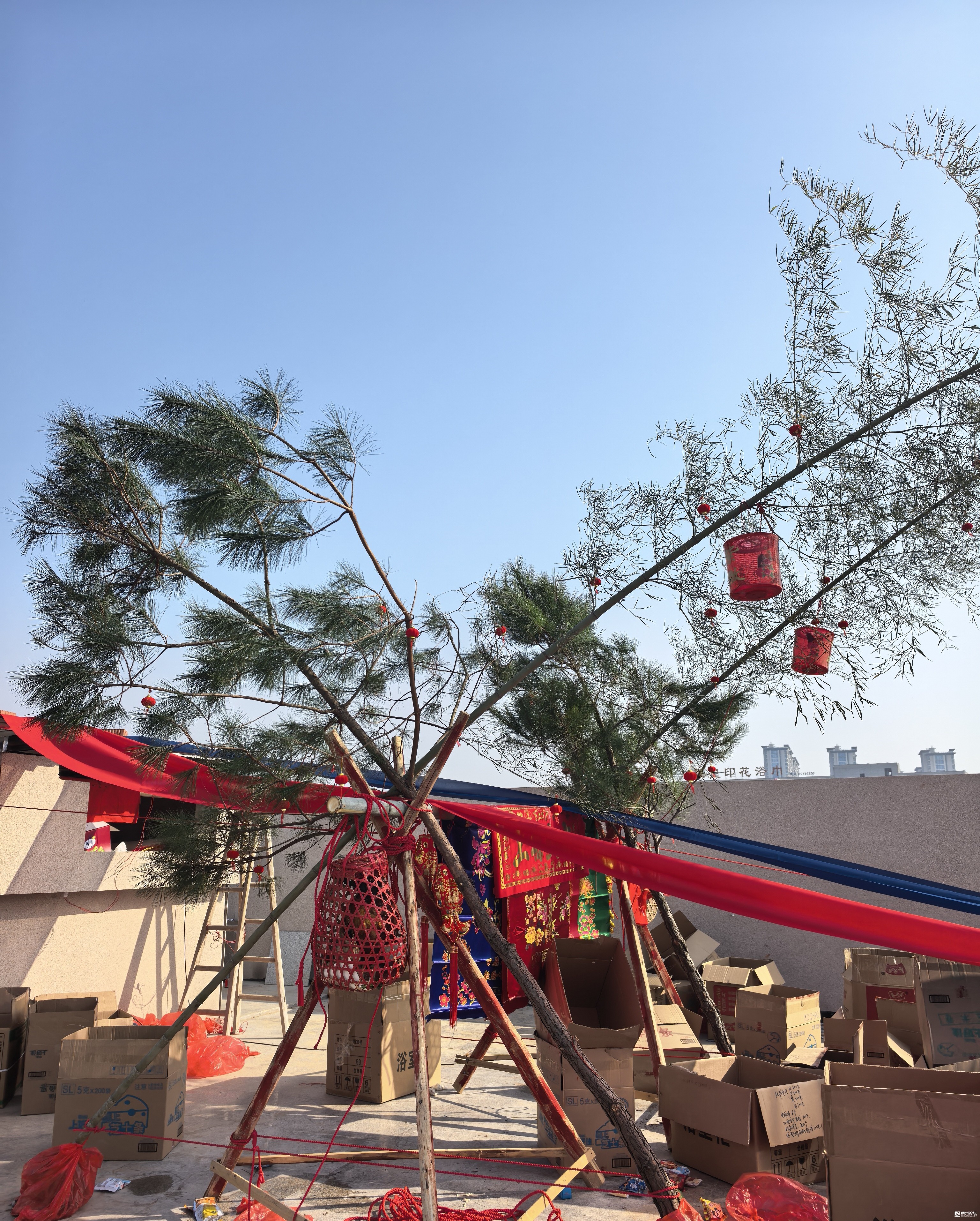 居新屋大喜事。居新屋很讲究,要择个黄道吉日。并在吉日的前三天,在屋顶正房位置用木头,松树,竹子等搭一个架子,架子上挂满了各种传统的利市的物品。特别是要从屋顶到屋下从上到下披一条长长的红布,一条青布。