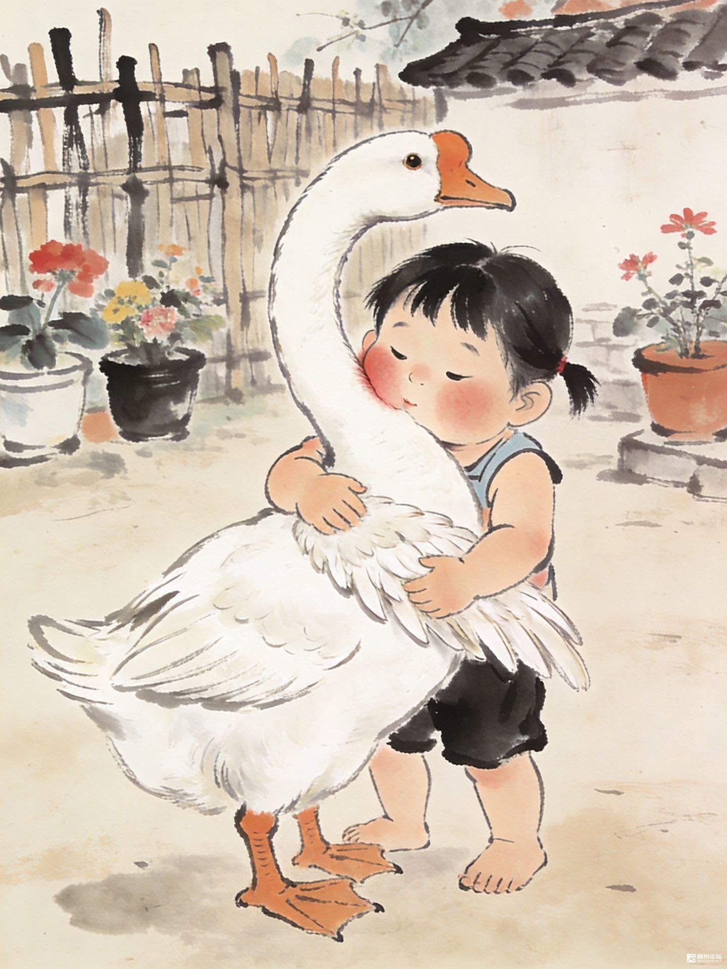 它的羽毛比云朵还软,脖颈弯成月牙时,绒毛蹭过脸颊,痒得人想笑。她光脚站在泥地上,脚趾头蜷着,把小身子都贴上去——倒像是要把这团白,揉进自己的影子里。