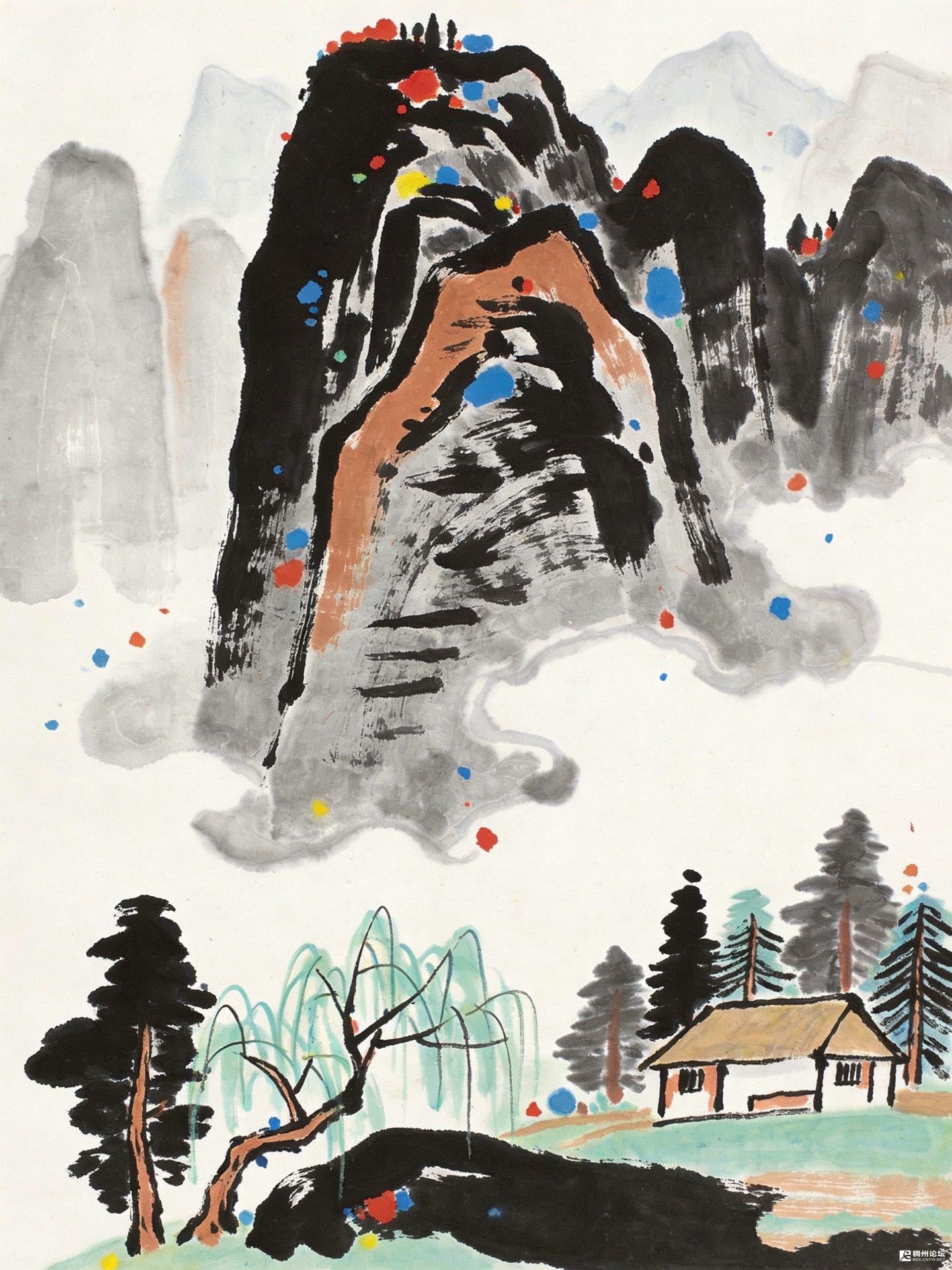 人总说“山水该清幽”,可这画里的山偏不。它把浓烈的彩、泼墨的黑、朦胧的灰揉在一块儿,倒像是天地在学孩童作画——管什么章法,爽快手,把心里头的亮堂,都泼到纸上去才好。