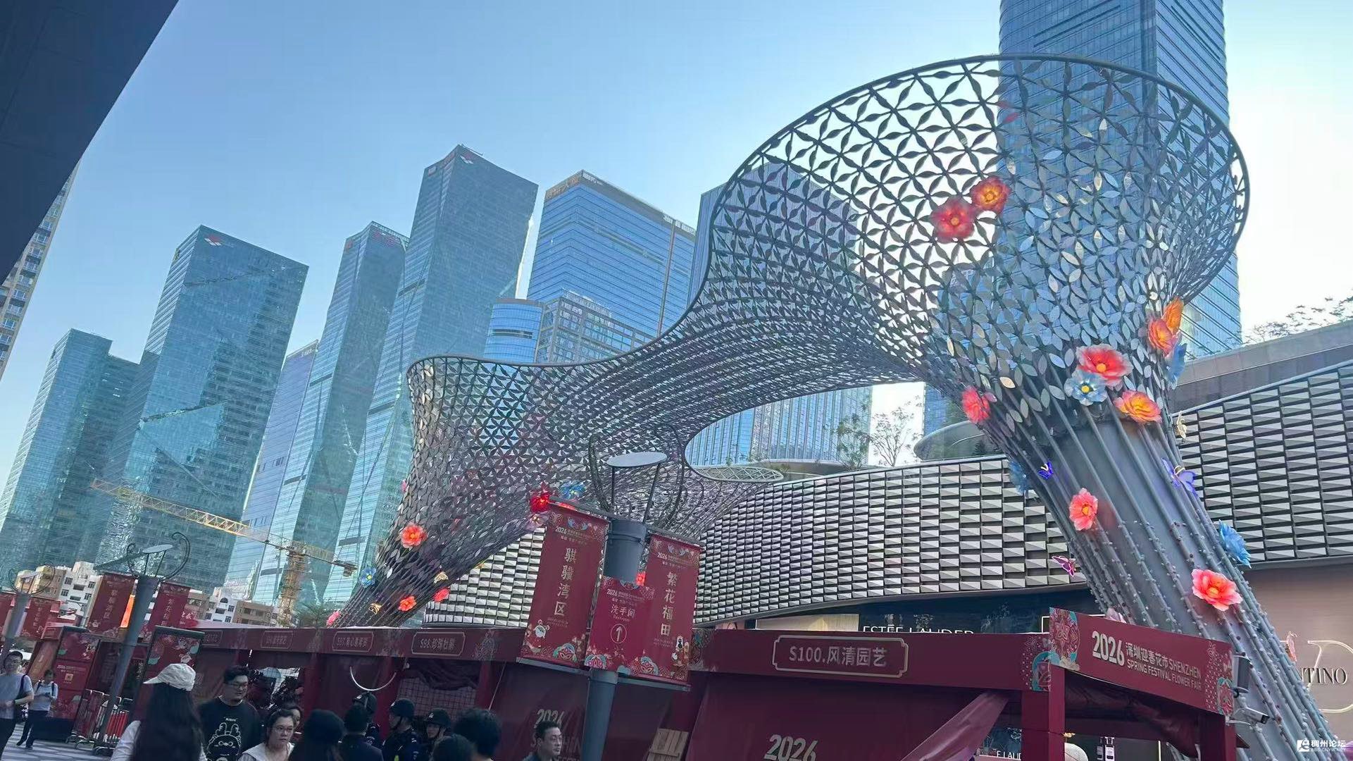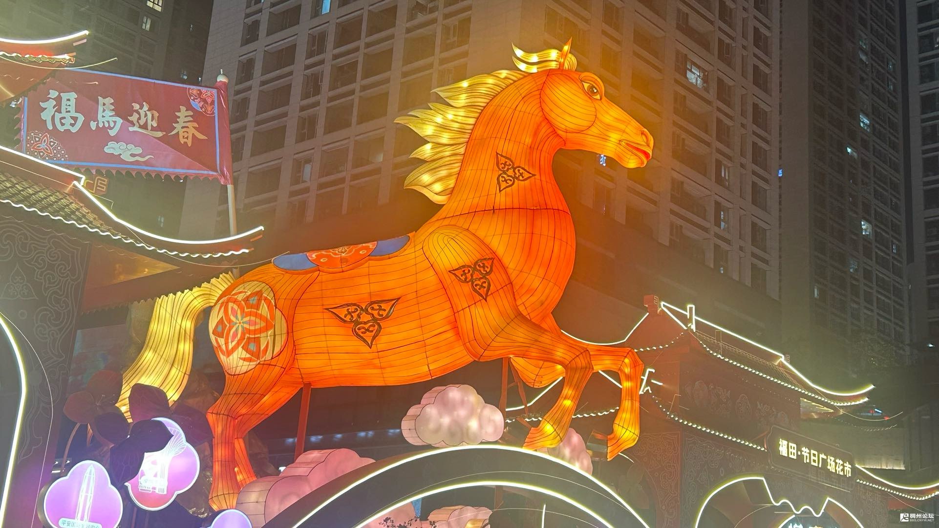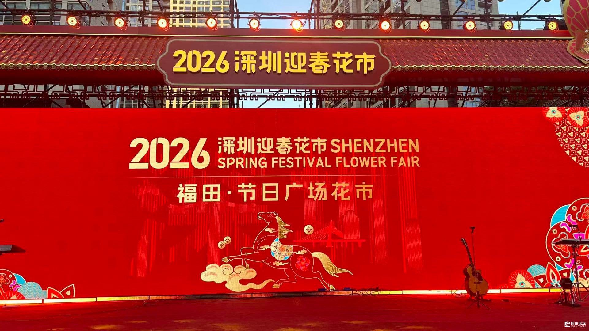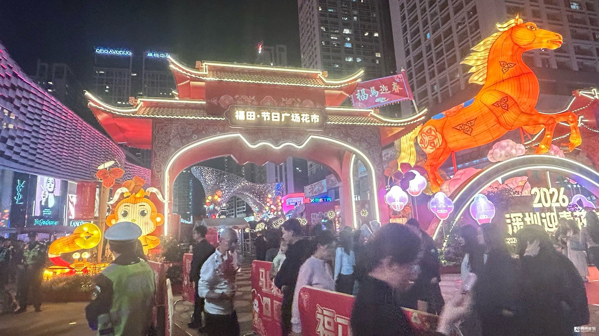 我们一行人刚到入口,看见两位工作人员拿着金属探测器对行人检查一番,然后很有礼貌的做着“请”的姿势,我们也不例外的得到了“请”。一进去,红瓦飞檐的牌楼就撞进眼里,顶上“2026深圳迎春花市”的鎏金大字亮得晃眼,连灯光都闪着新年的靓丽。顺着人流往里走,正对的大屏红得热烈,金色的奔马图案裹着祥云,旁边“福田·节日广场花市”几个字,直接把马年的喜气焊在了场景里。