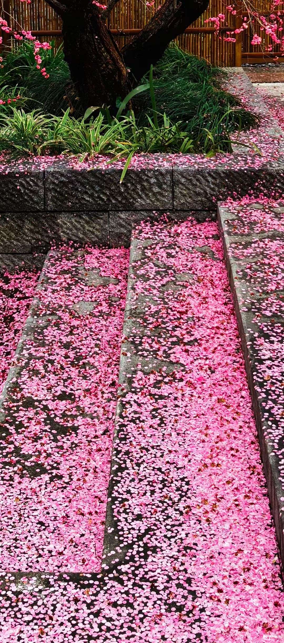 石阶斜印浅香痕,乱粉垂云半掩门。
