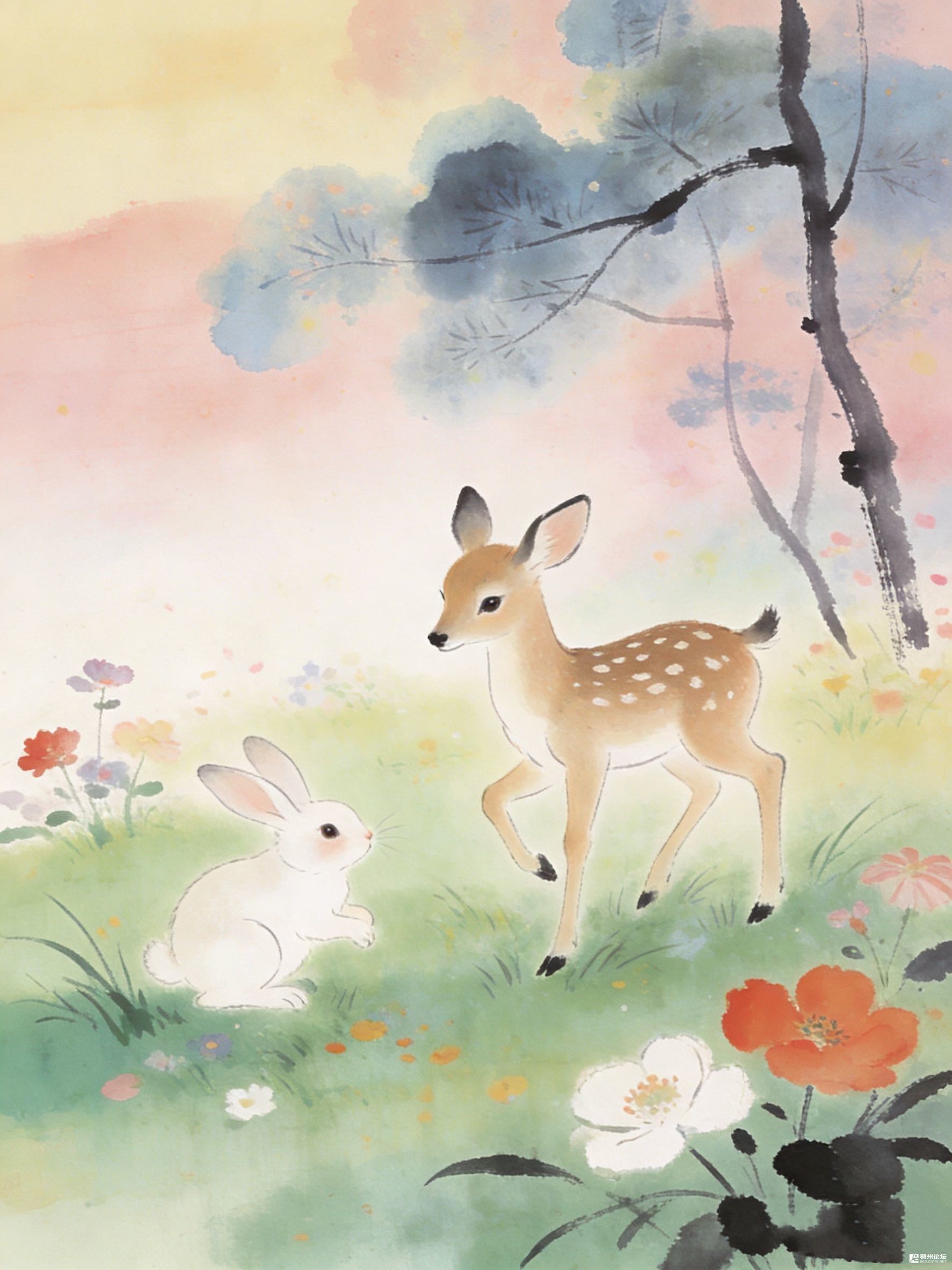 小鹿把蹄子抬得轻轻的,像怕踩碎草叶上的光。白兔竖着耳朵,红眼睛亮得能盛下整片霞。花们也不吵,红的、白的、紫的,各自开着,倒像是约好了给这俩小家伙当背景。