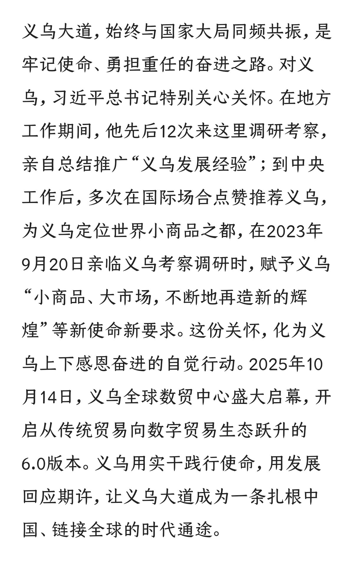春晚荣光定格璀璨瞬间,奋进征程永不止步。义乌大道,是义乌人刻在骨子里的发展基因,是这座城市跨越发展的强大动力。站在新的历史起点,肩负打造中国式现代化县域典范的新使命,义乌必将沿着这条守正创新、开放包容的大道勇毅前行,让“莫名其妙、无中生有、点石成金”的传奇,在新时代焕发更加夺目的光彩。