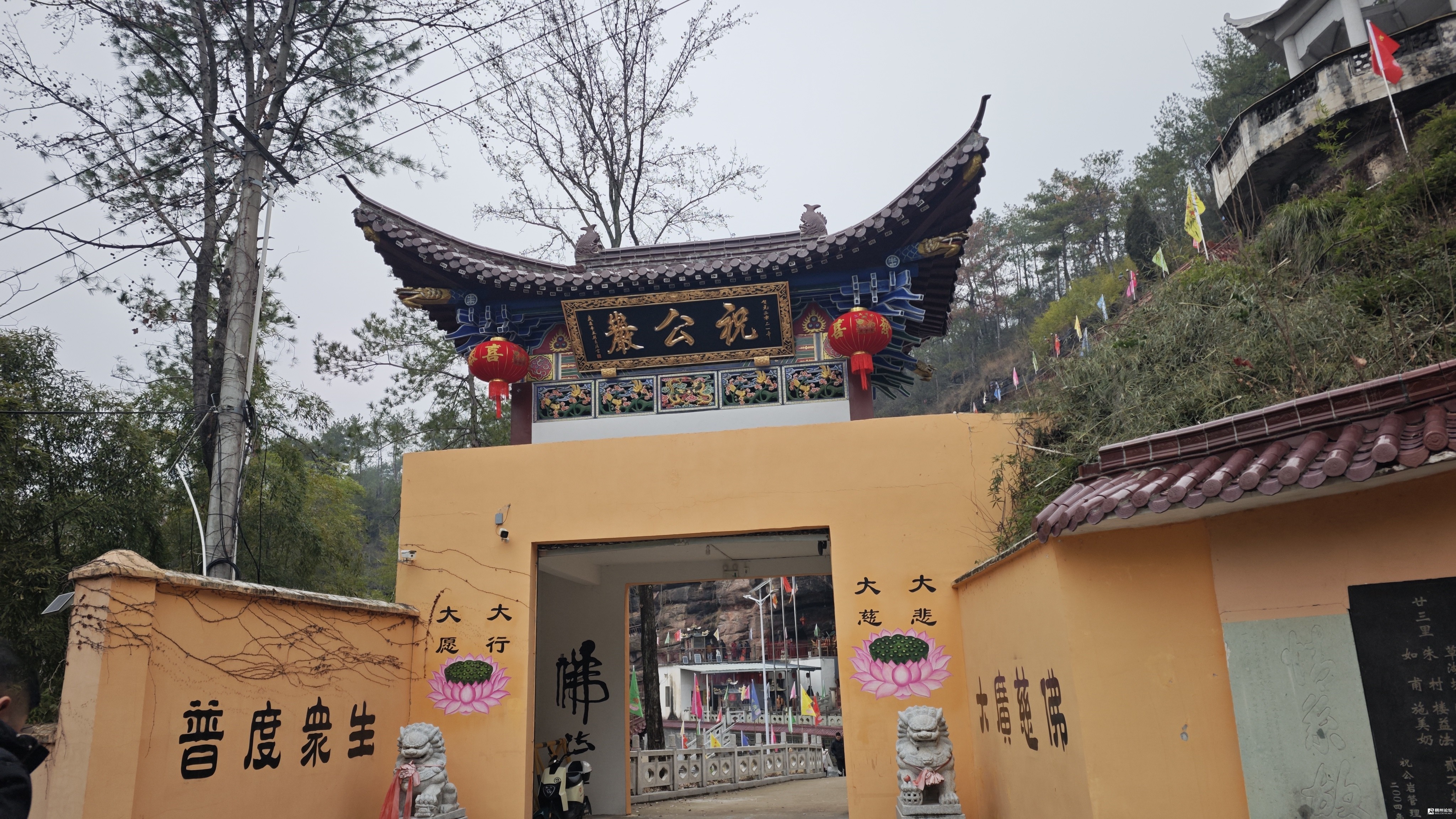 祝公岩被誉为“义乌悬空寺”,据传东晋时期的名士祝公瞻曾在此隐居修行,建筑风格融合了 佛 教和道教的元素。