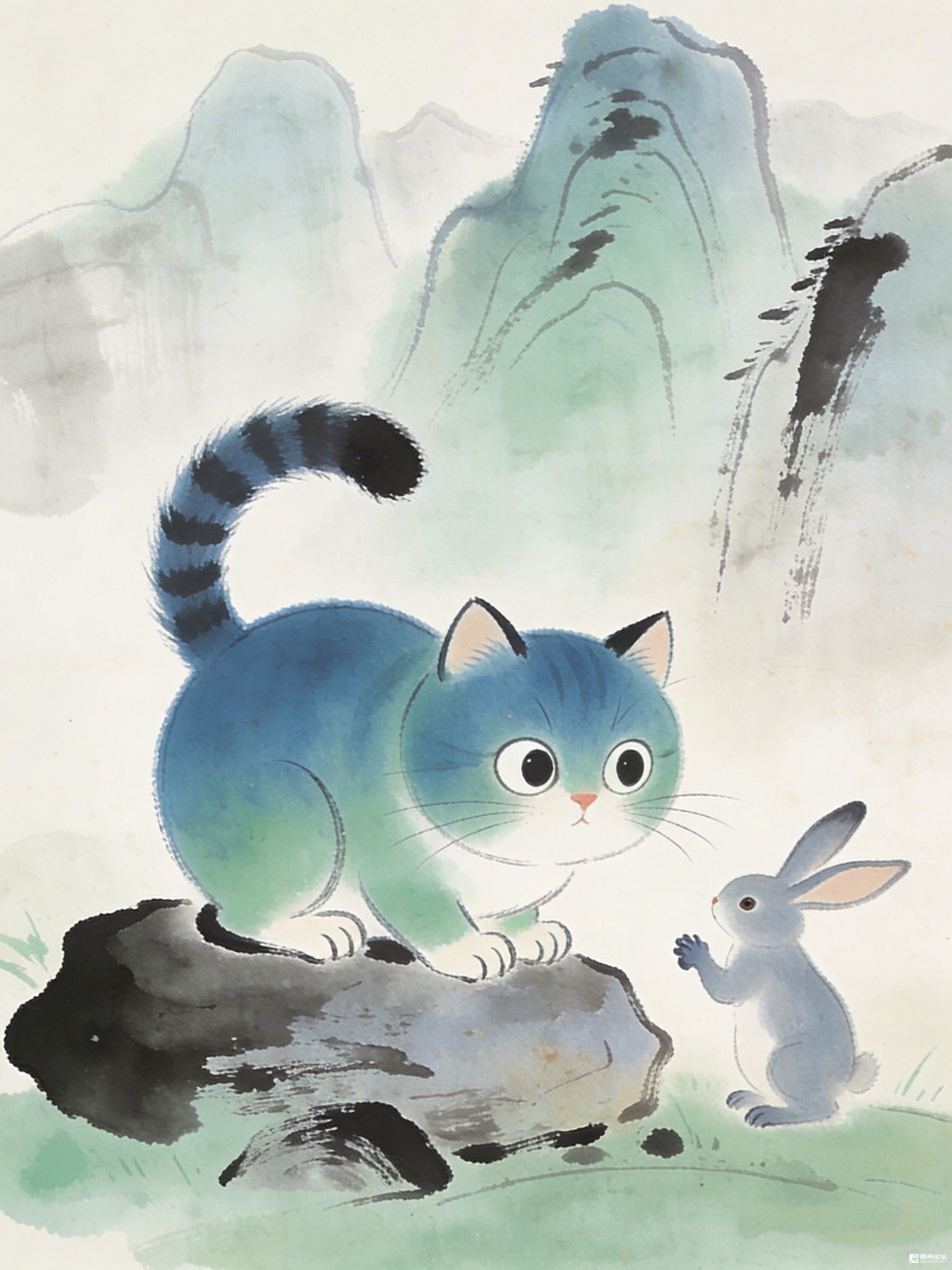 山把自己洇成淡青的云,倒像是给这场相遇搭了个软乎乎的戏台。蓝猫把尾巴卷成问号,圆眼睛亮得能盛下整片春山,它定是头回见这么小的、会站着拱手的生灵。