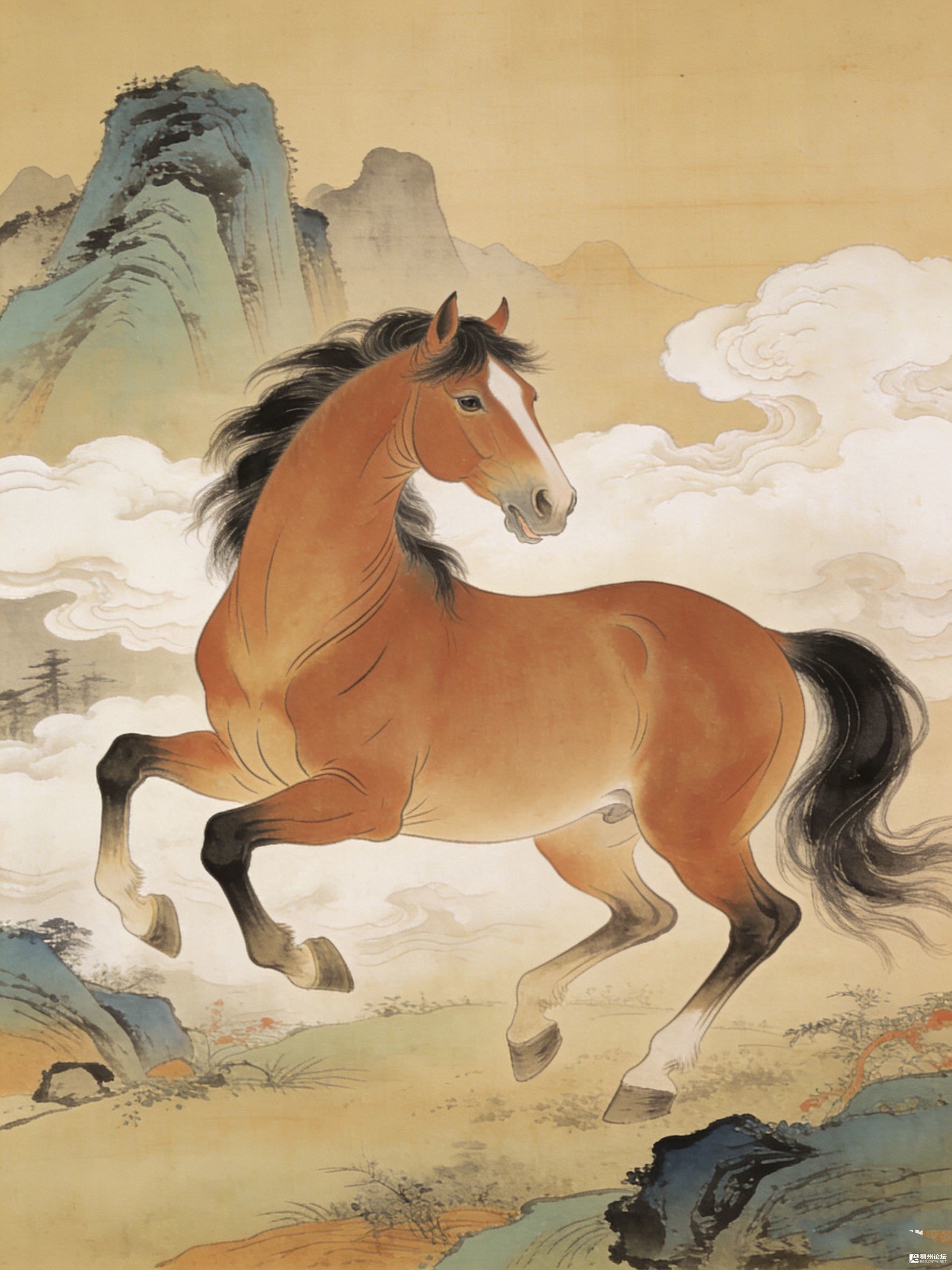 它不是在跑,是把蹄子伸进云里蘸了蘸,便让天地都跟着漾起来。鬃毛是被风揉散的墨,尾巴甩成流动的黑绸,连肌肉的起伏里,都藏着云的软、山的静。