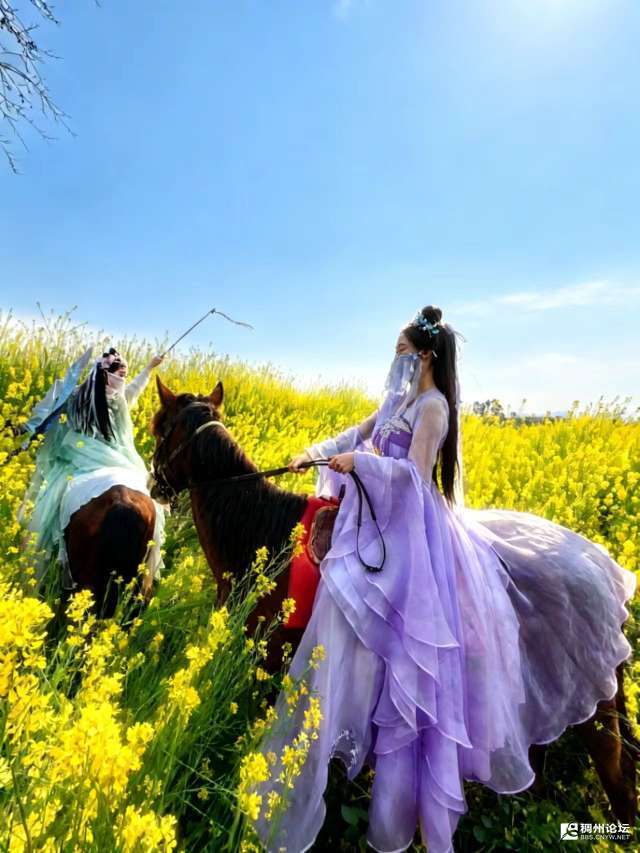 再往前走,眼睛一亮——田埂那边明晃晃的,黄灿灿一大片,油菜花开得泼泼洒洒。走近些,正对着那片金黄出神,忽听得一阵清脆的笑声。几个姑娘穿着各色的古装,长袖飘飘的,正站在花丛里拍照。风吹过,花枝摇,她们的发带也飘起来,人和花搅在一起,分不清哪个更鲜亮些。