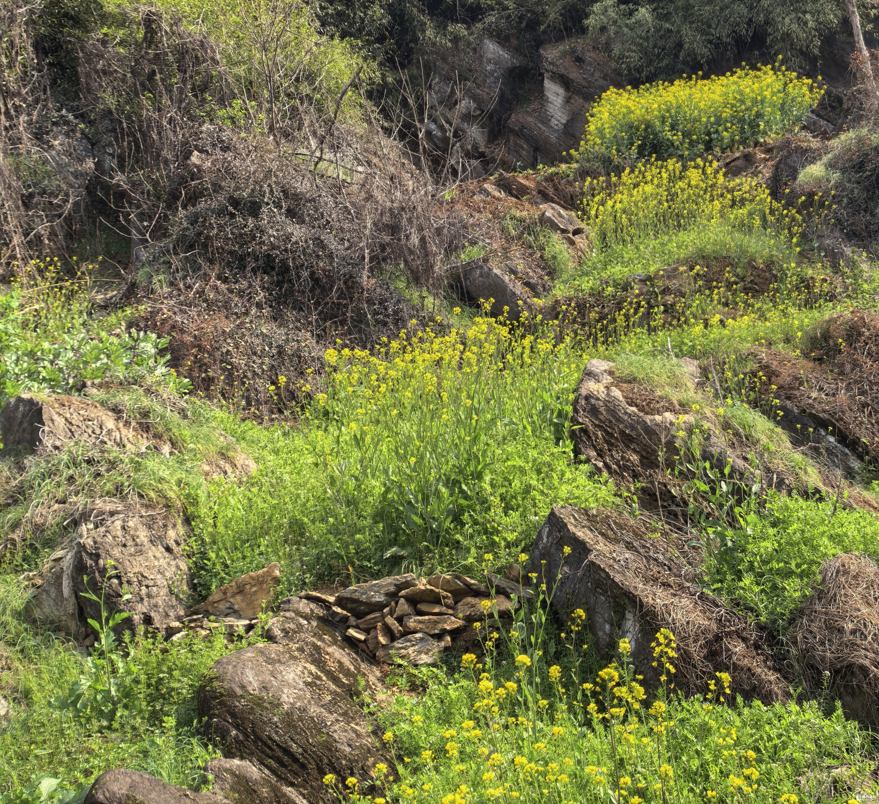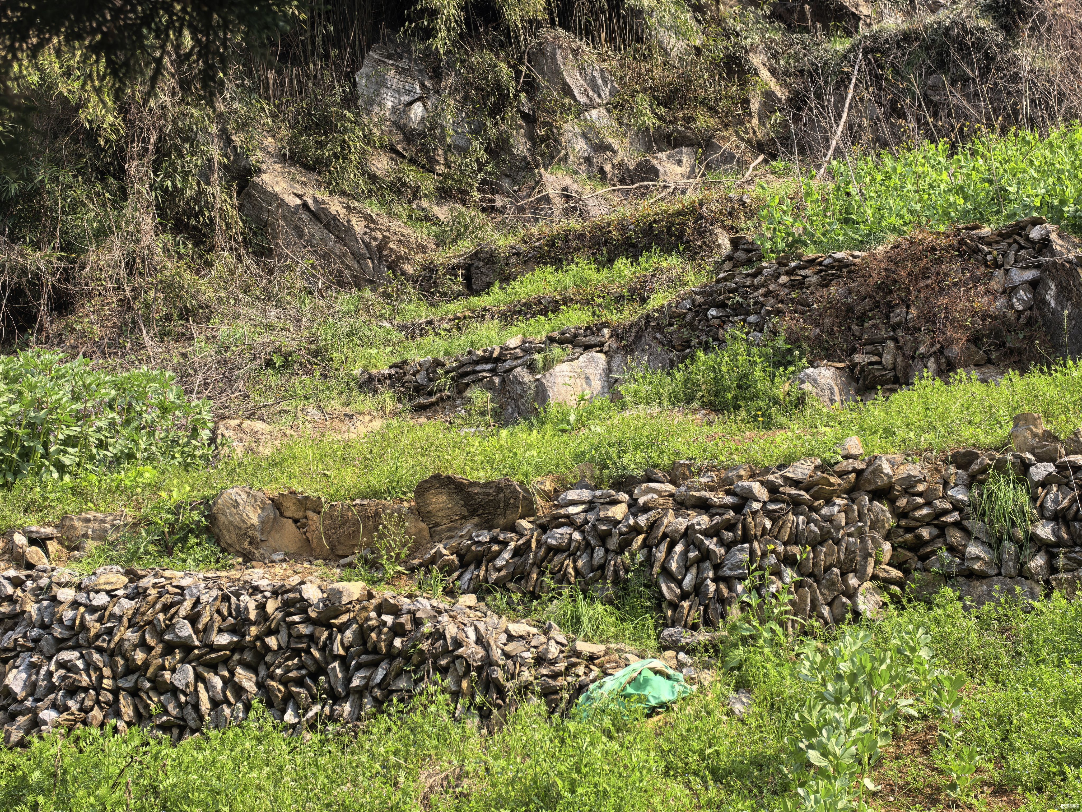 乱石堆中找土,成畦,种上农作物,增收。挖捡出来的乱石一块块的叠成墙加固边沿,防止水土流失。这就是老一辈农民对土地的真爱。他们用一点一滴汗水留下的一小块一小块的土地是多么的得之不易。