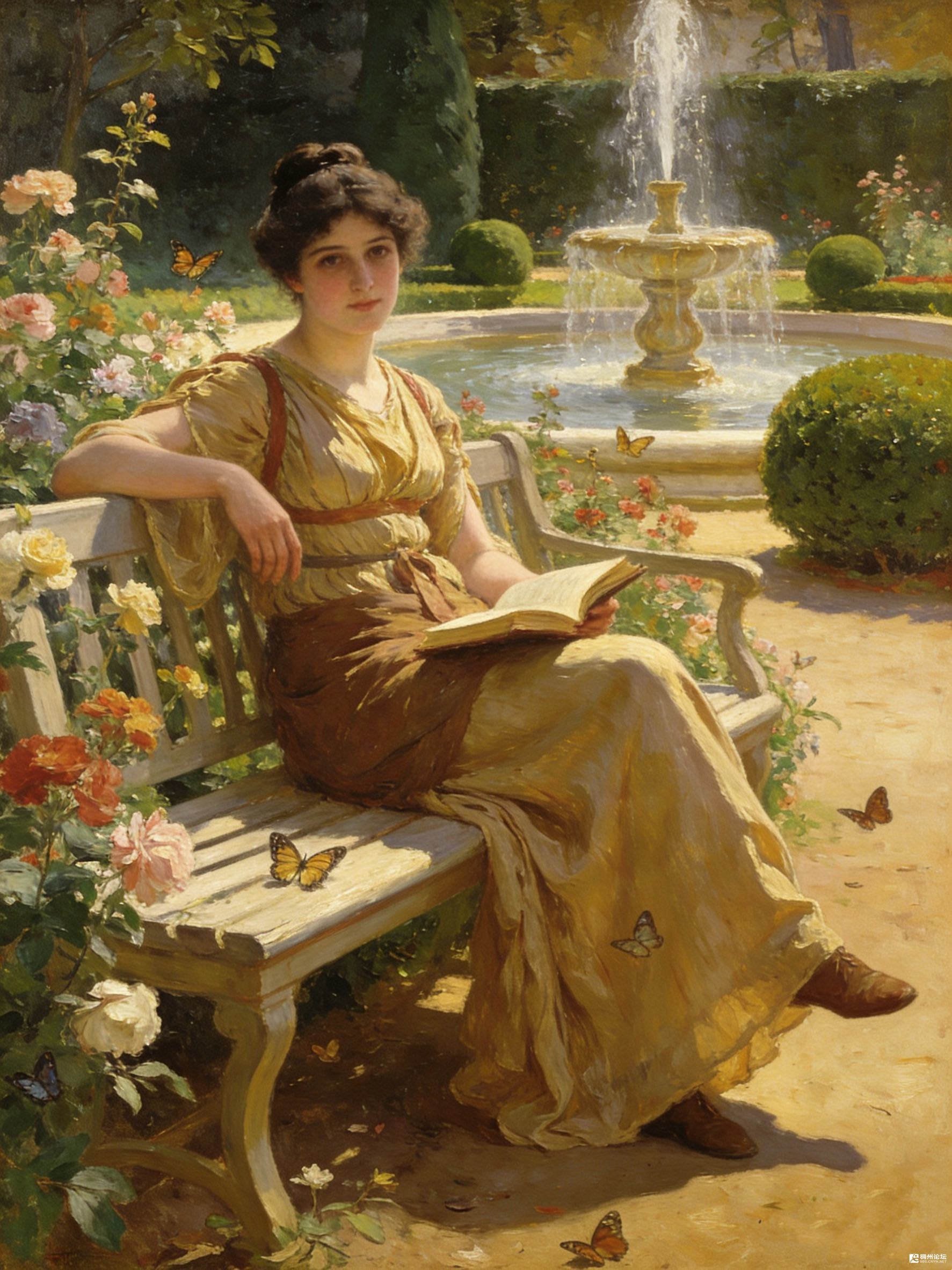 书页被风掀起一角时,蝴蝶正停在木椅的扶手上。它翅膀上的黄,和书页边缘的烫金,还有裙摆被阳光晒暖的杏色,混在一块儿,像把春天的蜜全泼在了这园子里。