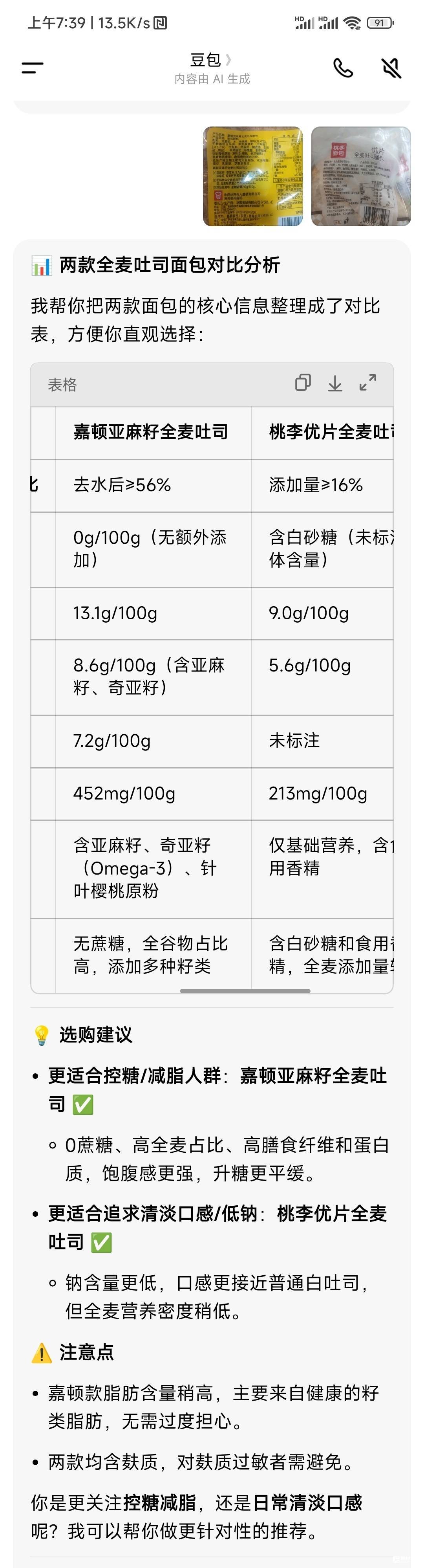 山姆买的嘉顿全麦面包和超市买的桃李全卖面包用豆包一对比发现山姆就是山姆不玩文字游戏