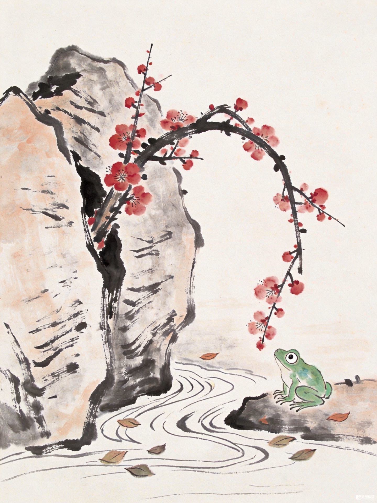 梅枝把红垂成溪的书签,青蛙蹲在石上,圆眼睛瞪得溜圆——倒像是在研究这朵花,究竟是春的标点,还是冬没吃完的糖。