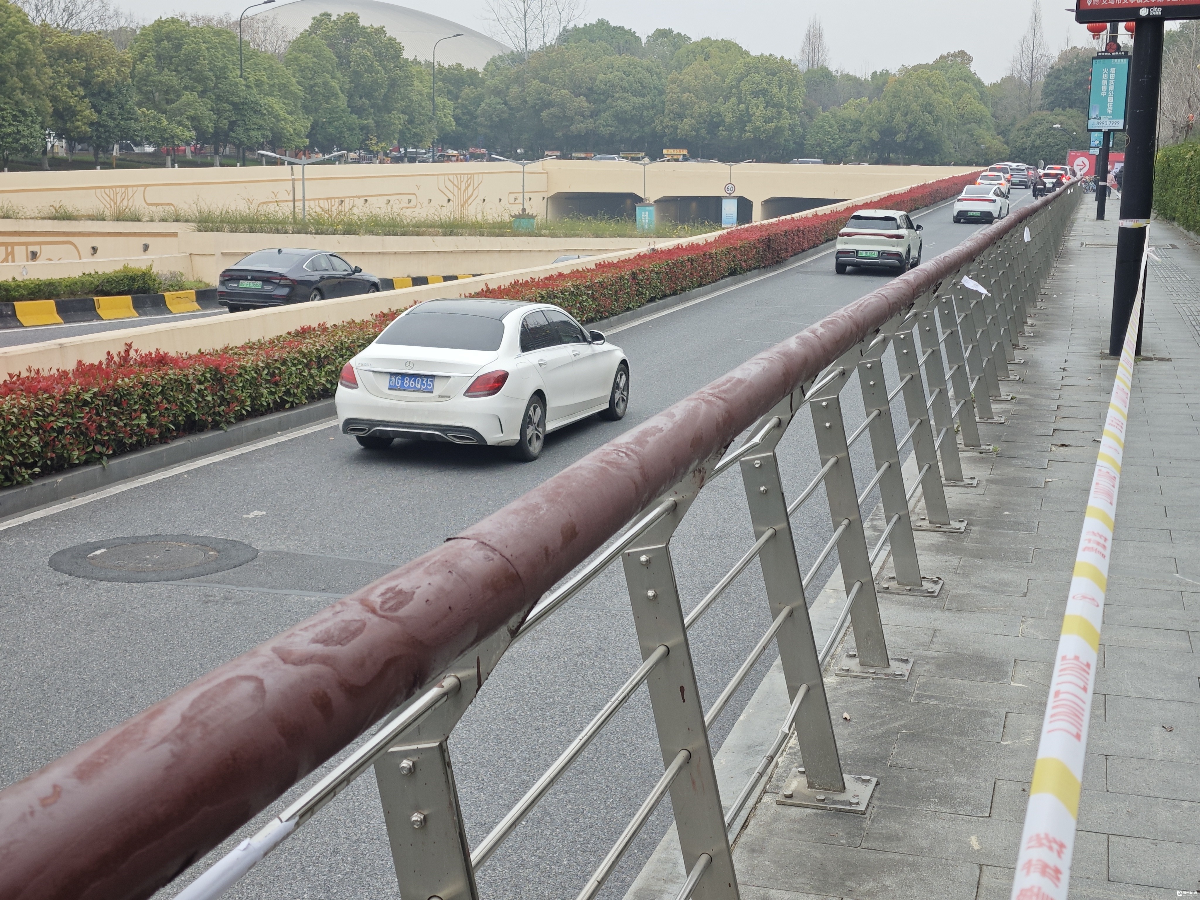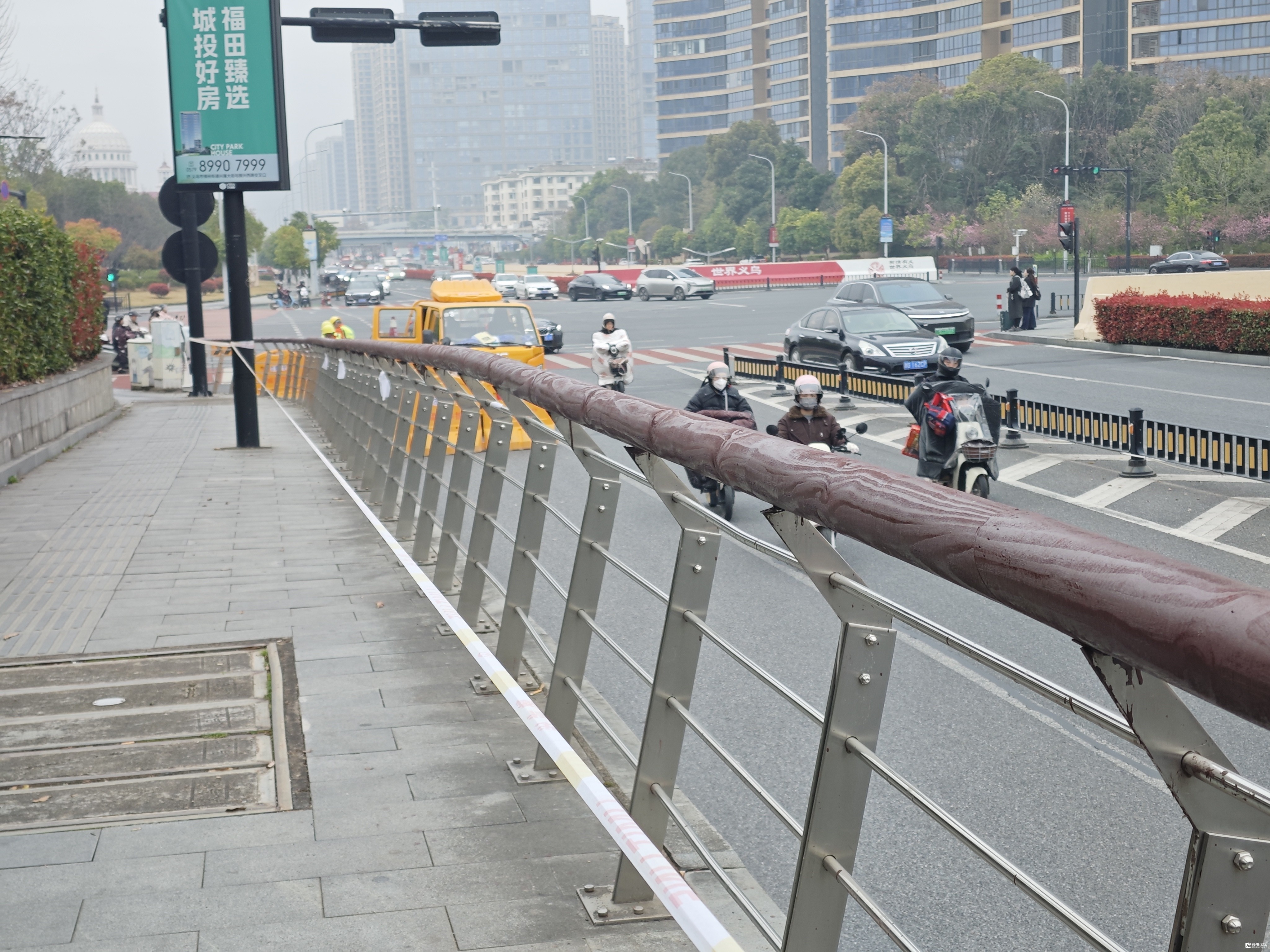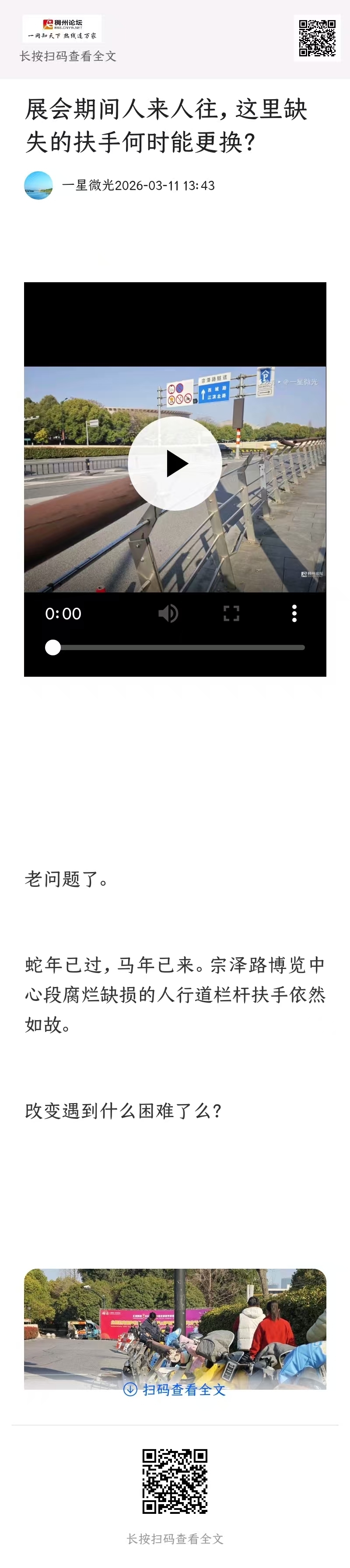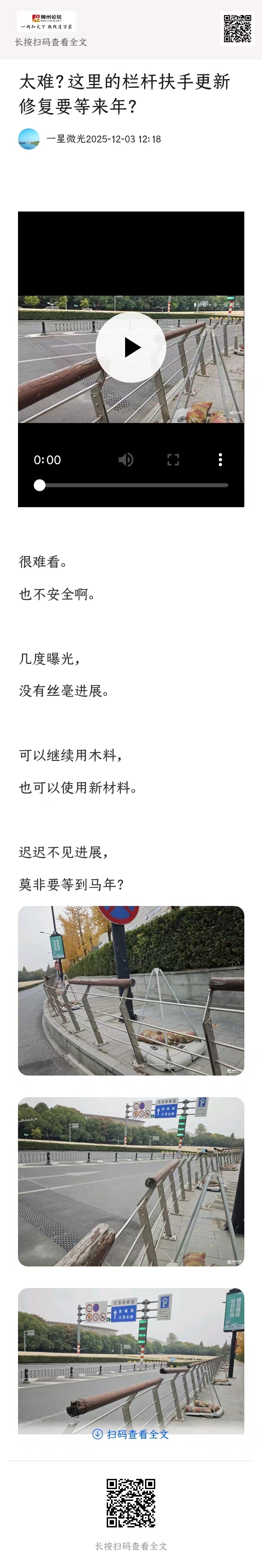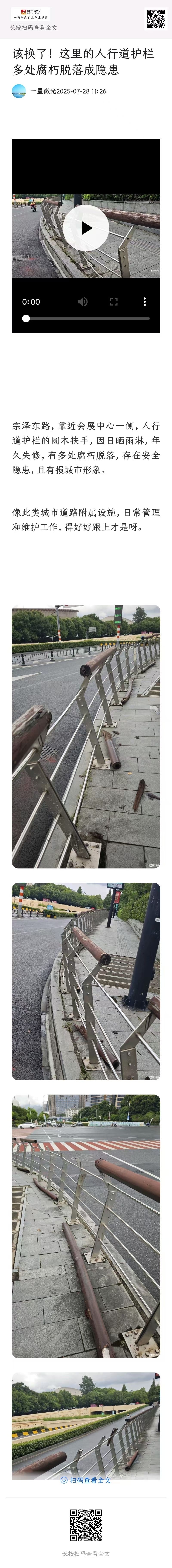 2025年7月28目,发帖反映“宗**路,靠近会展中心一侧,人行道护栏的圆木扶手,因日晒雨淋,年久失修,有多处腐朽脱落,存在安全隐患,且有损城市形象”的问题。