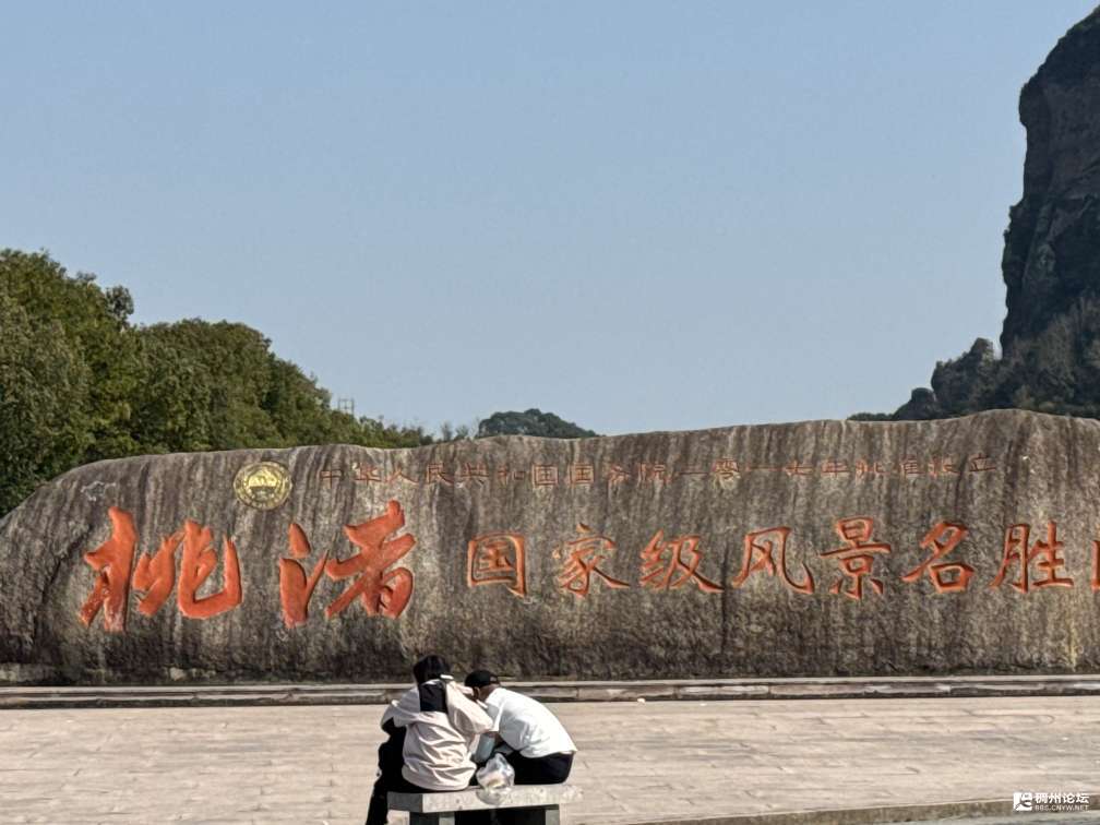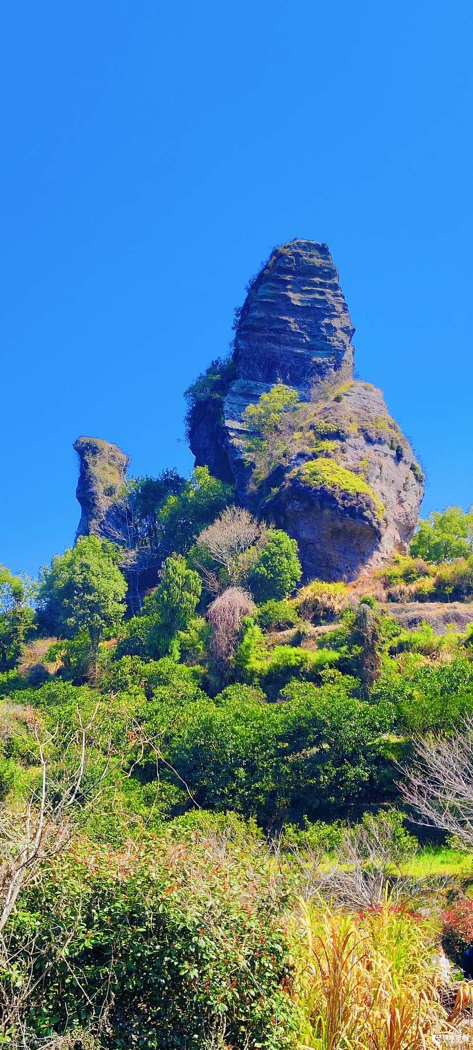 周围的山,奇峰林立,站在石柱峰脚下,仰头望去,那山岩的垂直面,简直是四面临空平地起高楼;石柱峰的上半部分为流纹岩,呈米黄色,下半部分为花岗岩,呈米白色,上下两部分岩性不同,界线十分明显,这可是八千万年前从海底冒上来的奇观。攀爬峰顶的路有点陡,回望左边山上的玉壶岩,像一只开屏的孔雀面向桃江翩翩起舞。那神色披着阳光、衬着蓝天,仿佛想腾空而去,沉思着又舍不得脚下这番美景。过了一线天,登上峰顶,再俯瞰桃江十三渚,却已换了模样。