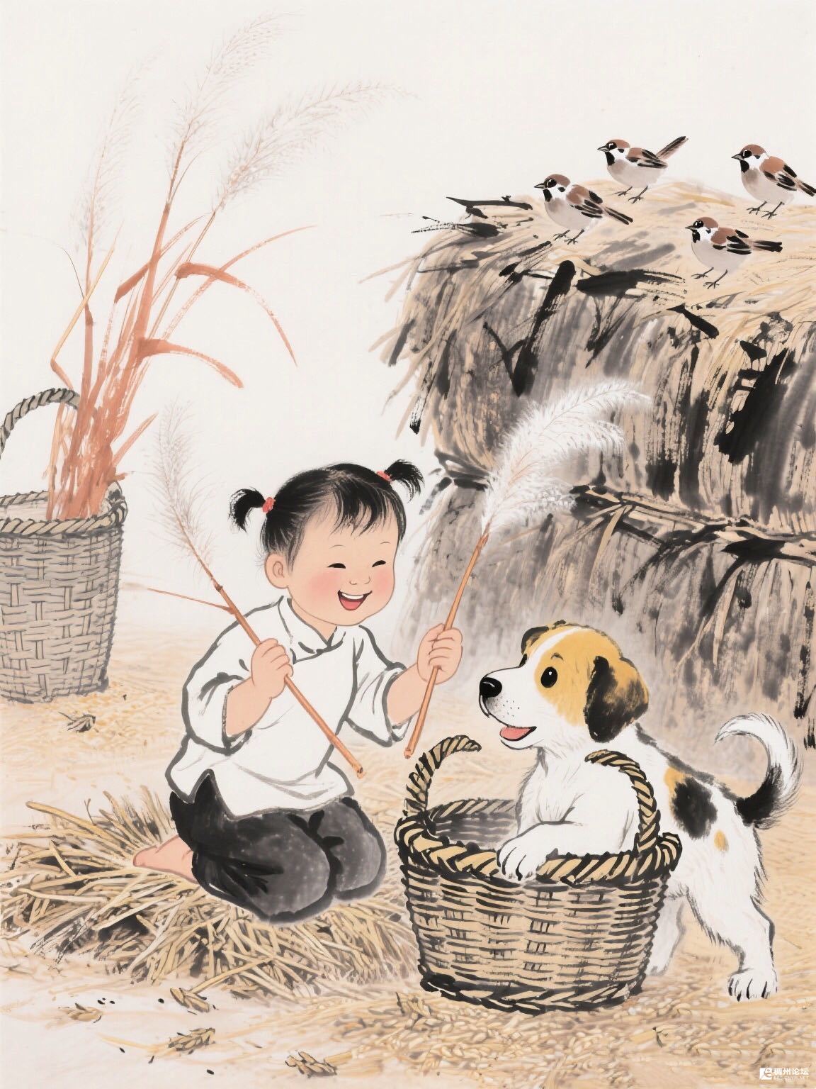 麻雀们蹲在草垛上,把自己看成最挑剔的观众,小脑袋一点一点,评断着这场“人狗芦花剧”。草垛是墨泼的山,篮子是编的船,连地上的谷粒,都成了亮晶晶的星星碎屑。