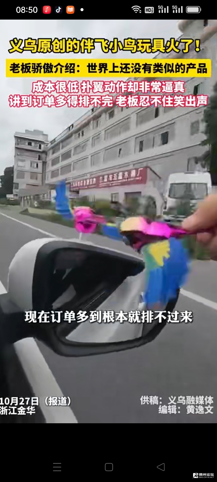 汽车,电瓶车,后视镜上的金属小鸟,叫伴飞鸟,车开时,像真鸟一样,会振动羽翅,伴车飞着,叫伴飞鸟。创意人是义乌国际商贸城的老板。陈老板,有次驱車去西藏,路上,窗外有一只可爱小鸟,一直在车窗外伴飞,带走了一路行程的寂寞……回家后,想到开车有小鸟伴飞多好,于是经过千万次的试验,终于做成了既会振翅飞翔,又牢固的金属的一一伴飞鸟。现已有大量出口订单。义乌本地車上还未看到伴飞鸟,前日,在杭州某停车场拍到的伴飞鸟。