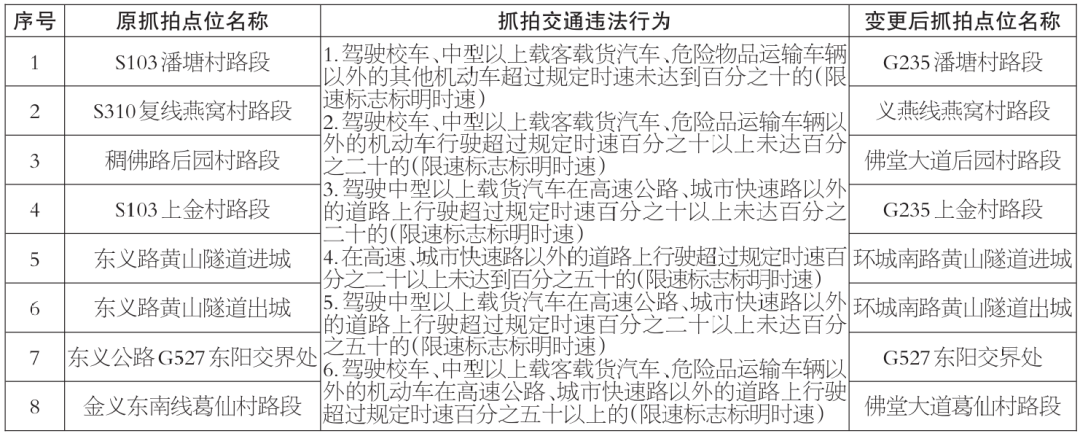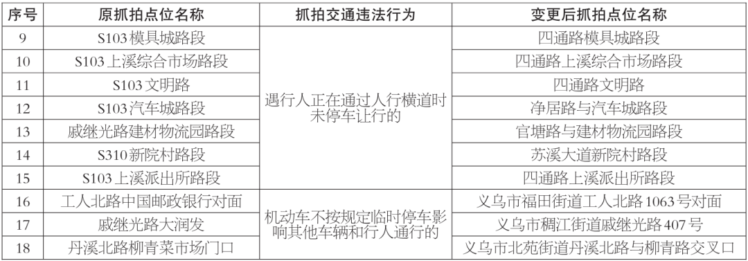 因道路名称变更,根据《中华人民共和国道路交通安全法》《道路交通安全违法行为处理程序规定》等法律法规规定,现将我市内18处违法抓拍点位名称变更公示如下: 以上电子监控违法抓拍设备的物理位置、功能参数、抓拍违法行为类型均保持不变,交通管理相关规定持续有效,本次仅变更设备点位名称。请广大机动车驾驶人自觉遵守道路交通安全法律法规,文明驾驶,安全出行,共同维护道路交通秩序。来源 | 义乌市公安局交通警察大队 义乌商报 |